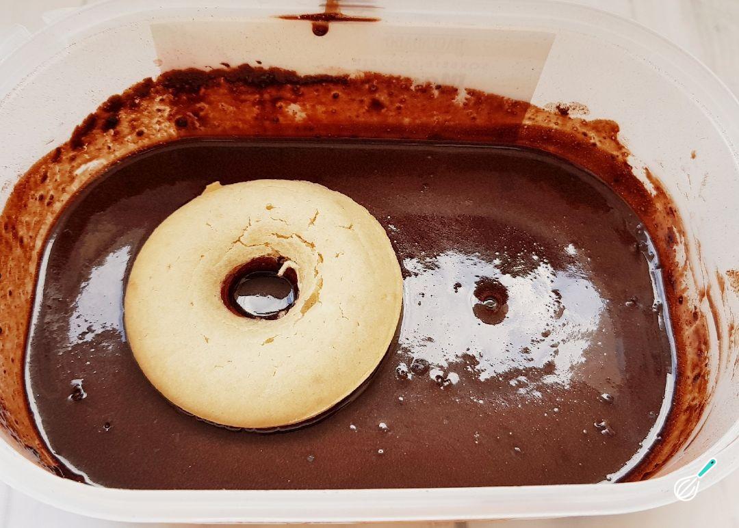 Pegue nas rosquinhas e mergulhe metade no creme de chocolate, como na foto. Deixe por 60 segundos, para que absorvam um pouco do creme, e retire com cuidado. Decore suas rosquinhas de farinha de trigo a gosto e reserve por uns minutos na geladeira, para que a cobertura de chocolate fique durinha.