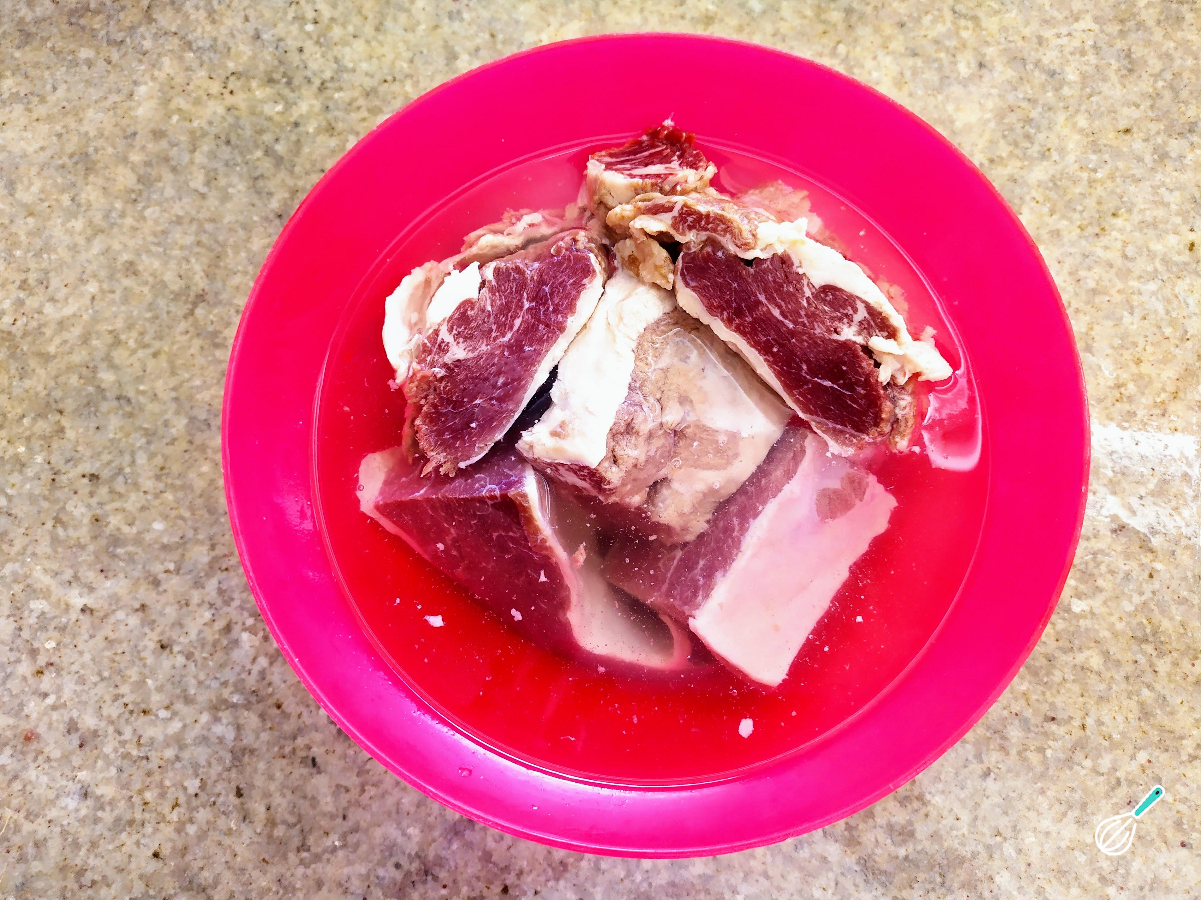 Dessalgue a carne , trocando a água por duas vezes. Coloque na panela de pressão e cozinhe por 20 minutos. Escorra a água e reserve.
