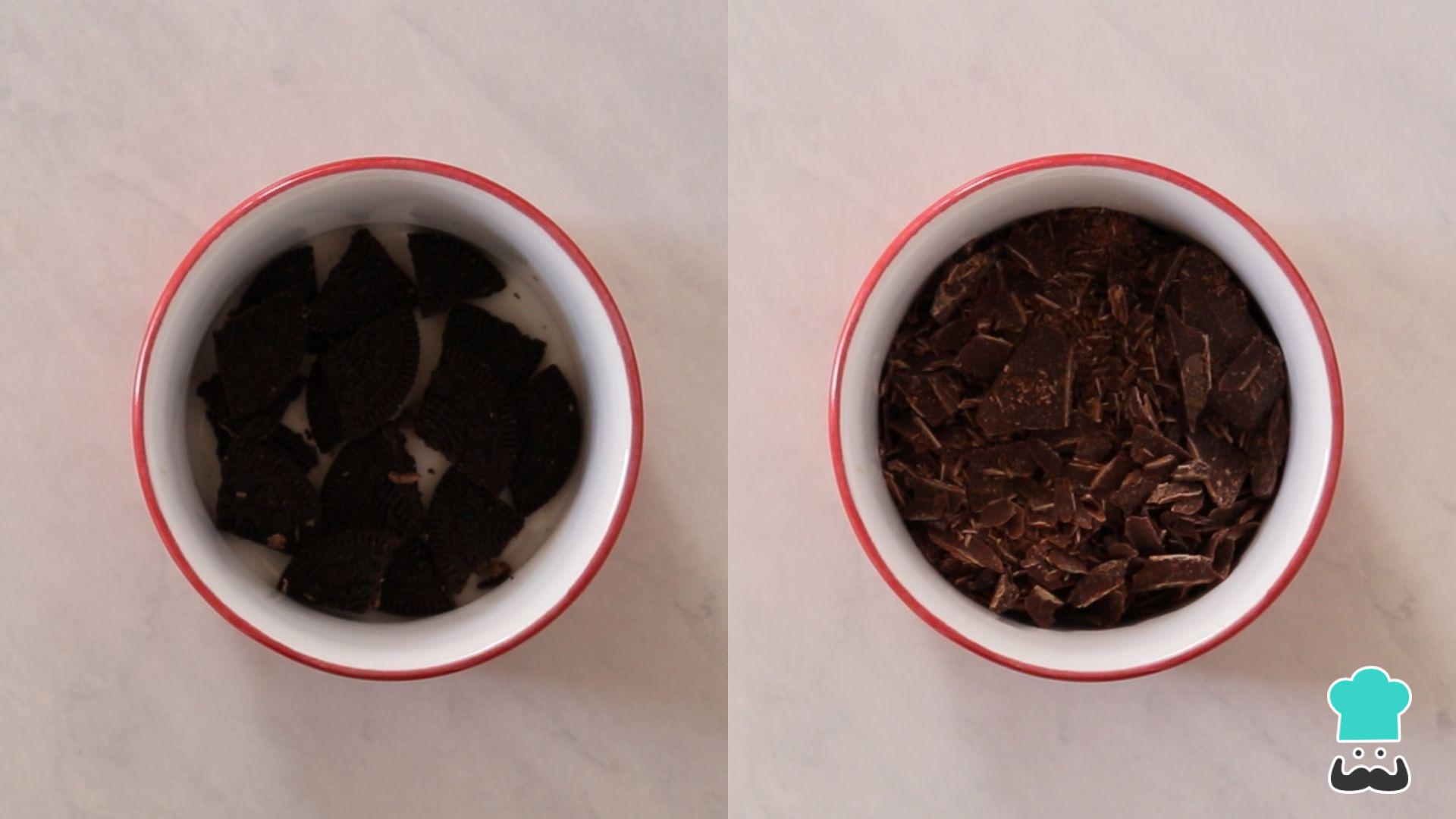 Em um refratário que possa ir ao forno faça uma camada de bolacha de chocolate e em seguida uma camada o chocolate em barra em pedaços.