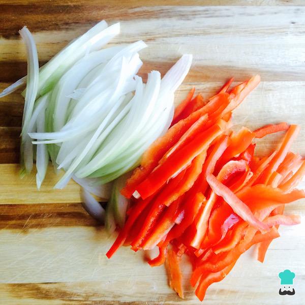 Para fazer sacanagem de mortadela, comece por cortar a cebola e o pimentão em tirinhas longas.
