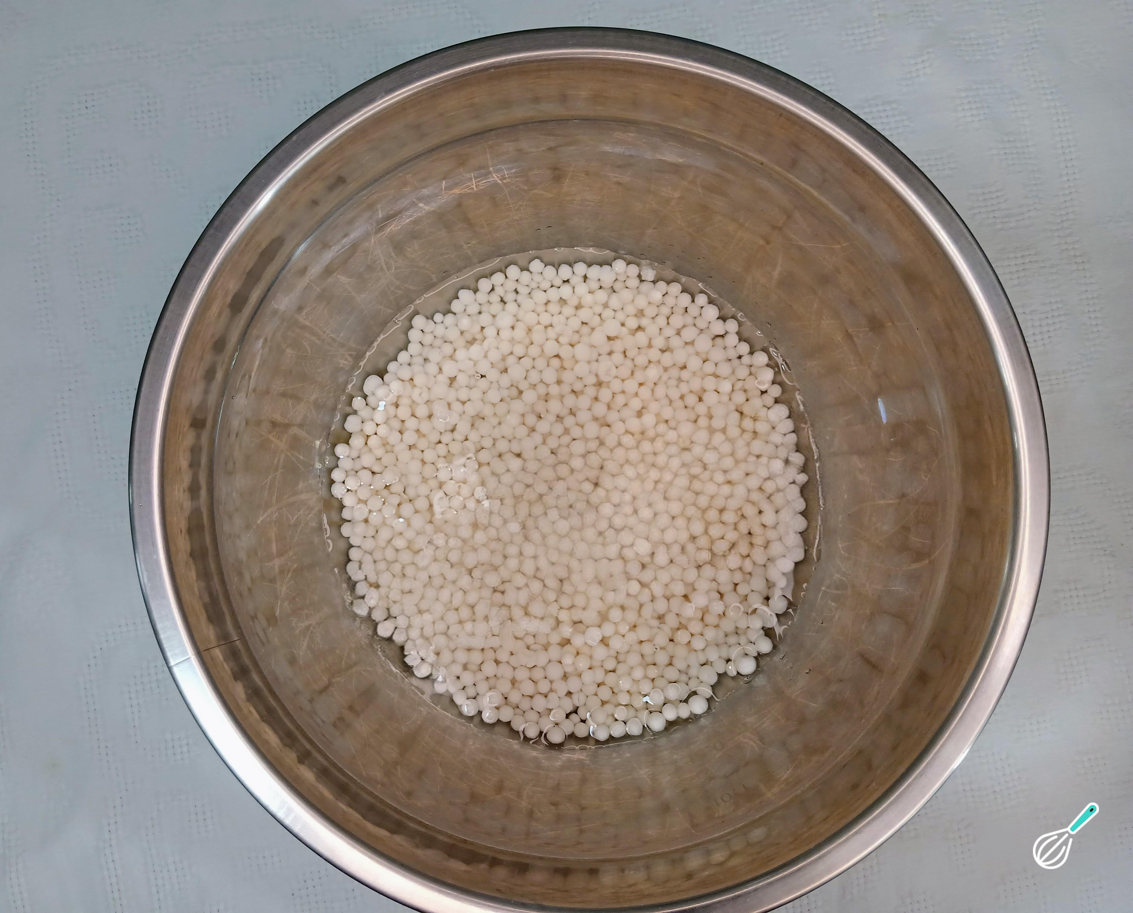Feito isso, coloque o sagu em um bowl e deixe de molho por, no mínimo, 30 minutos. Esse processo irá auxiliar na hora do cozimento e ficará muito mais fácil o preparo.