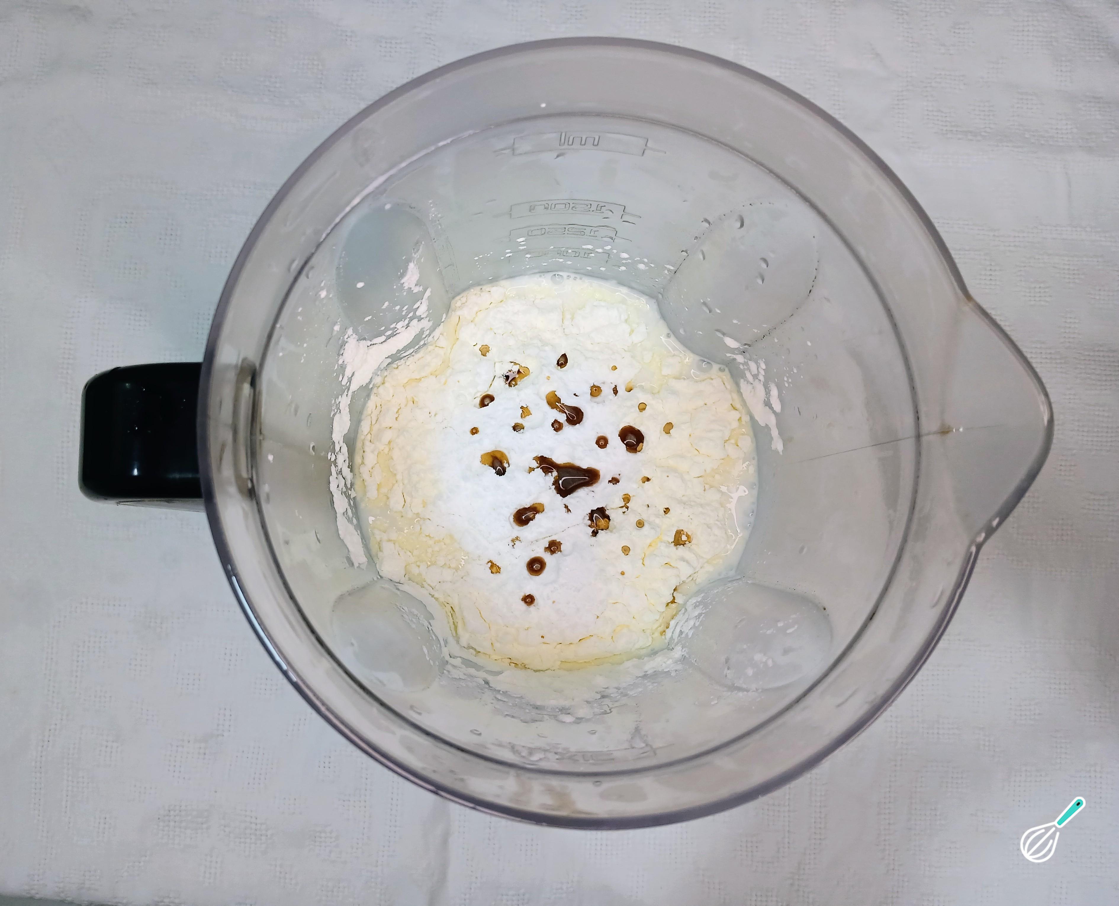 Em um liquidificador, coloque o leite de coco, o amido de milho, o creme de leite ou creme vegetal, a essência de baunilha e o açúcar. Bata tudo em velocidade média até ficar bem homogêneo.