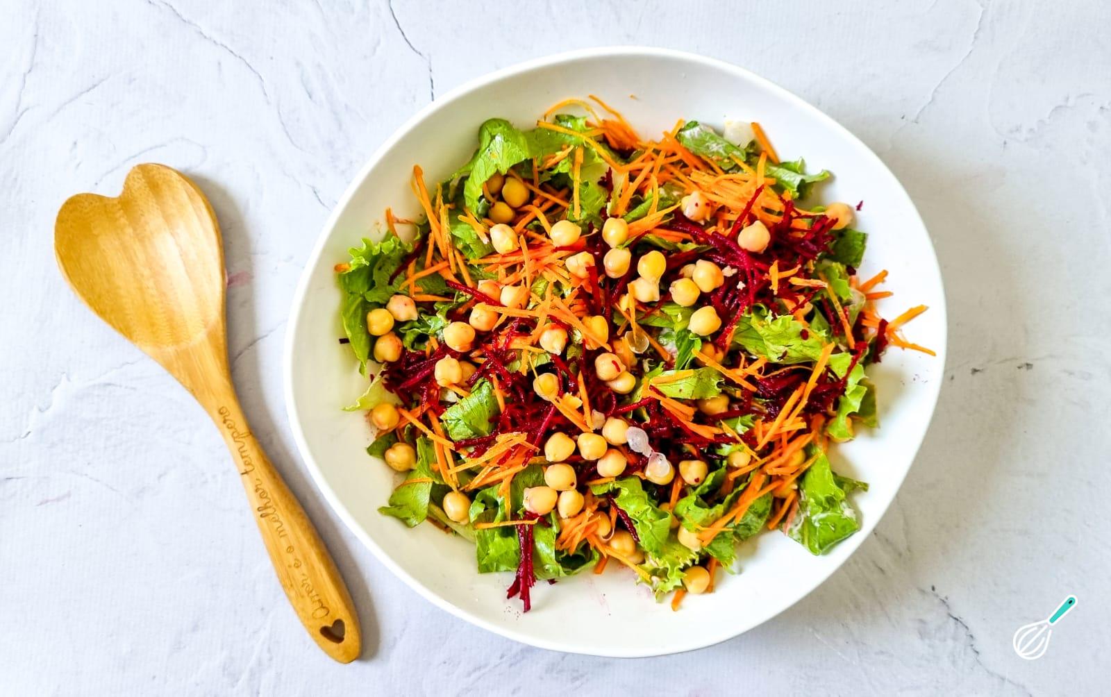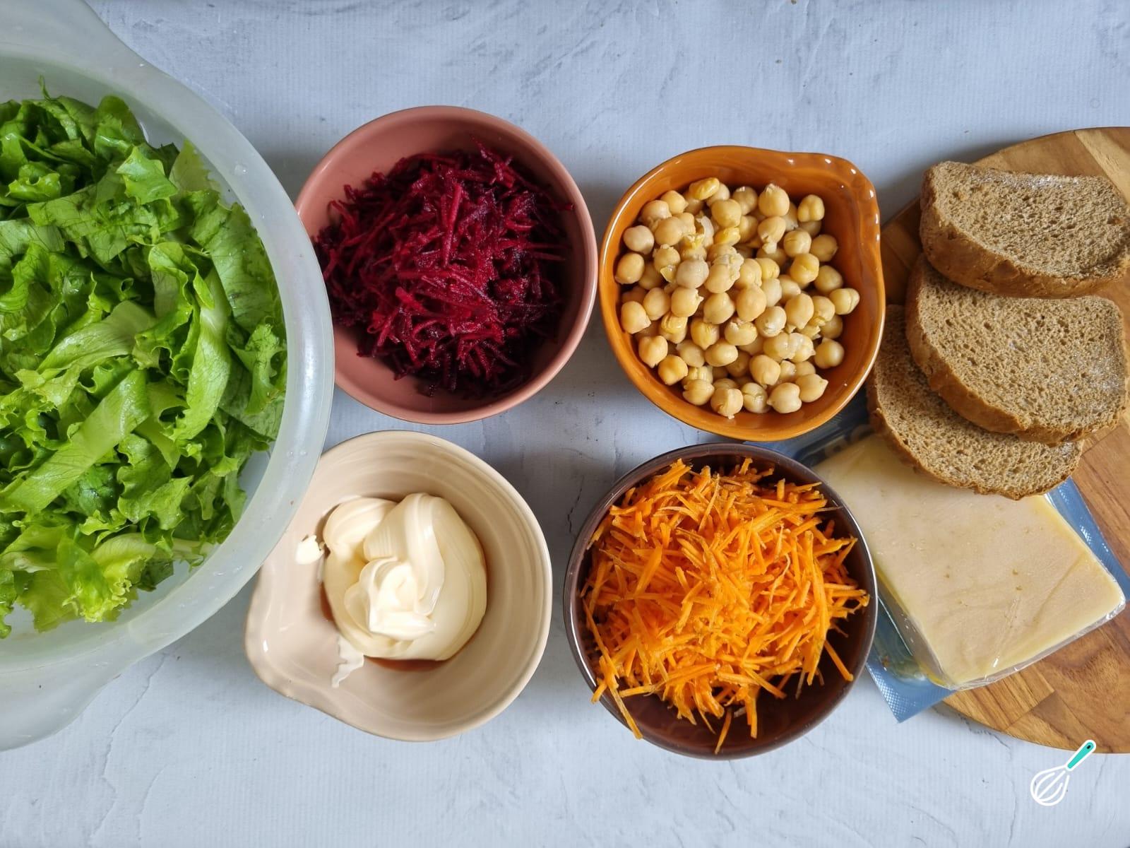 Comece separando e higienizando os ingredientes: lave a alface e deixe de molho na água com água sanitária por 15 minutos, após esse tempo lave bem em água corrente e corte em tiras largas. Higienize e descasque a beterraba e as cenouras, em seguida rale. Você pode cozinhar o grão de bico na água com sal ou pode comprar em caixinha já cozido, apenas escorra e lave em água corrente antes de usar. Para preparar os croutons corte as fatias de pão em cubos, coloque o azeite e asse numa frigideira ou no forno.