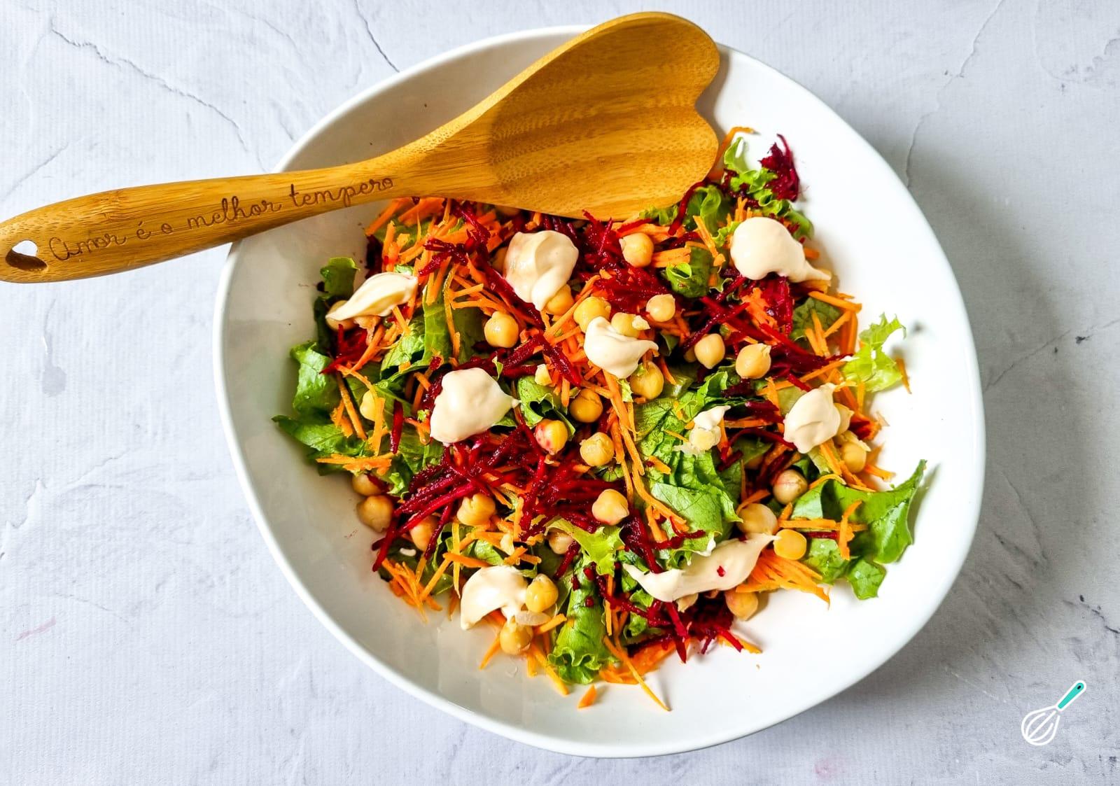 Salada é sempre uma boa pedida, principalmente em dias quentes. Essa salada vai te surpreender, e muito! Seja pelas cores, pelos sabores, pelas texturas, pela praticidade... além de ser linda e colorida ela é leve, refrescante, saborosa e super completa, se desejar acrescente apenas a proteína de sua preferência e está pronto seu almoço ou jantar. Muito prática, fácil de fazer e com rápido preparo, é a opção que faltava para você incluir mais salada nas sua refeições e colorir seus dias. Leve para o churrasco com os amigos ou prepare para você comer durante a semana, basta você pode deixar as porções já separadas em potes individuais e terá uma salada perfeita para a semana toda, e só temperar na hora de comer.