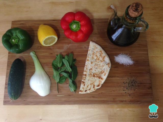 Comece por reunir todos os ingredientes desta salada libanesa - confira como fazer pão de pita caseiro!
