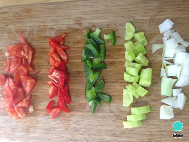 Em seguida descasque o pepino e pique todos os legumes em pedaços pequenos, como na imagem.