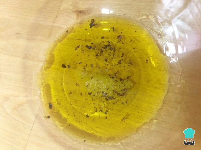 Separadamente prepare o tempero da salada, misturado o azeite de oliva com o sal, pimenta e suco de limão.