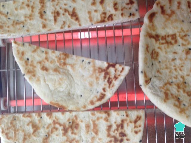 Por último, doure ligeiramente o pão de pita. Depois retire e corte em pedaços.