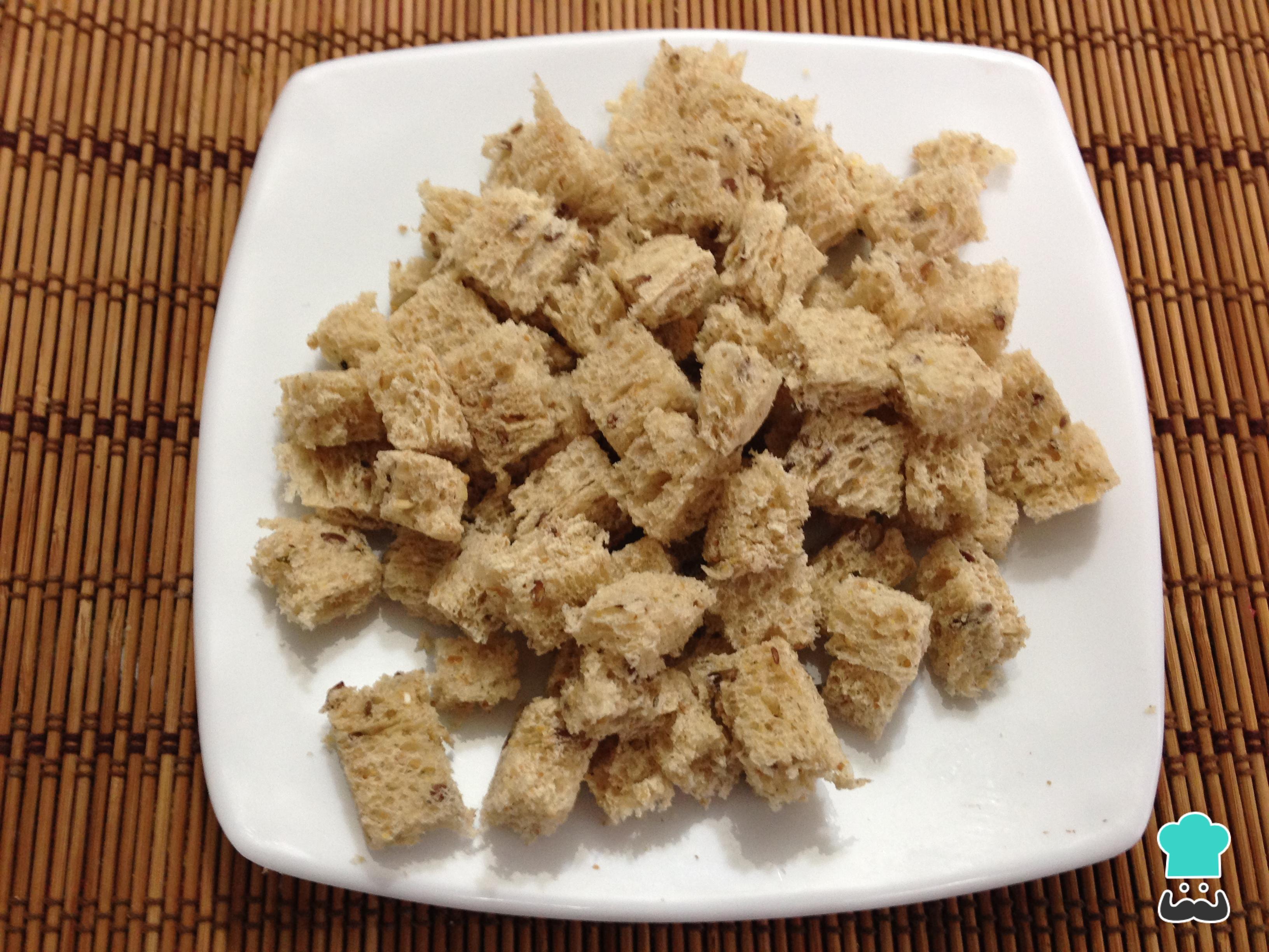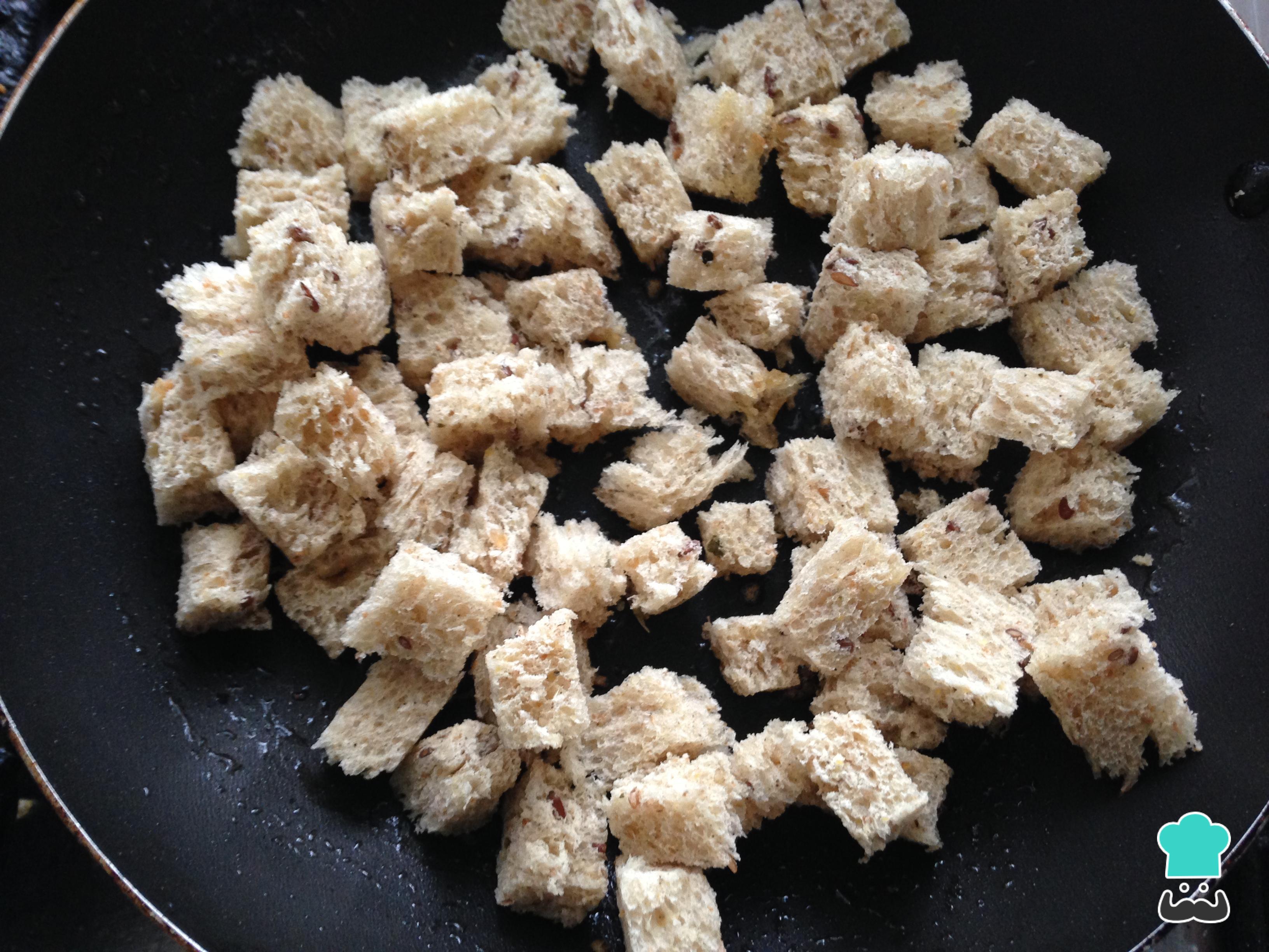 Prepare os croutons desta salada Caesar com frango e croutons: em uma frigideira com um pouco de manteiga, doure os cubos de pão e, quando estiverem bem dourados, retire.