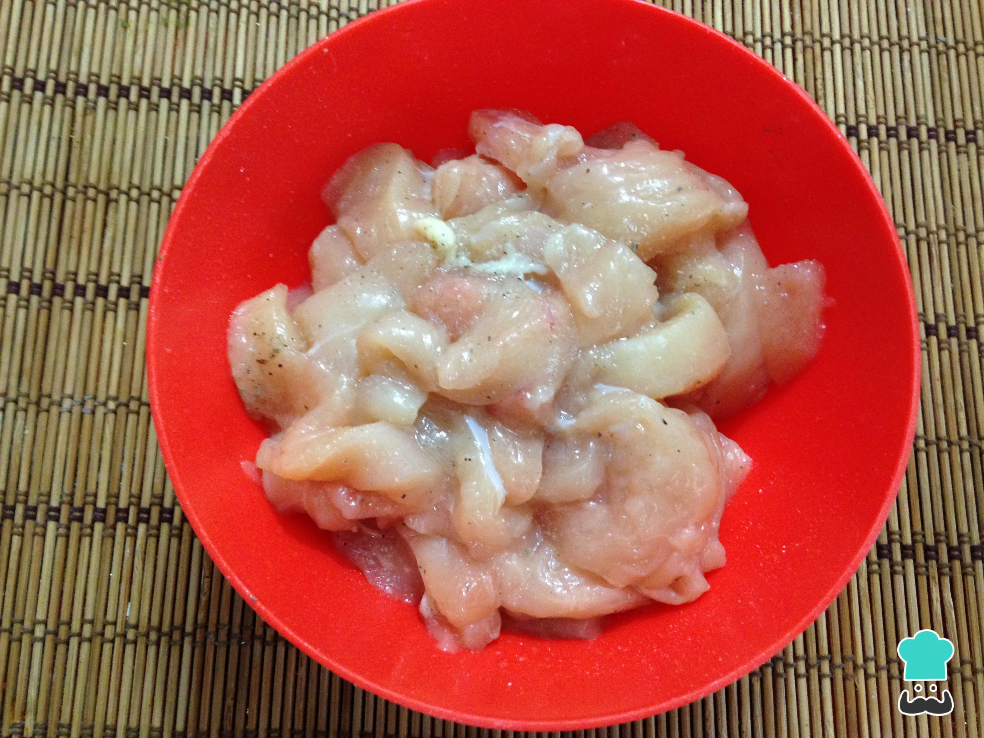 Corte o frango em tiras e tempere com sal e pimenta.