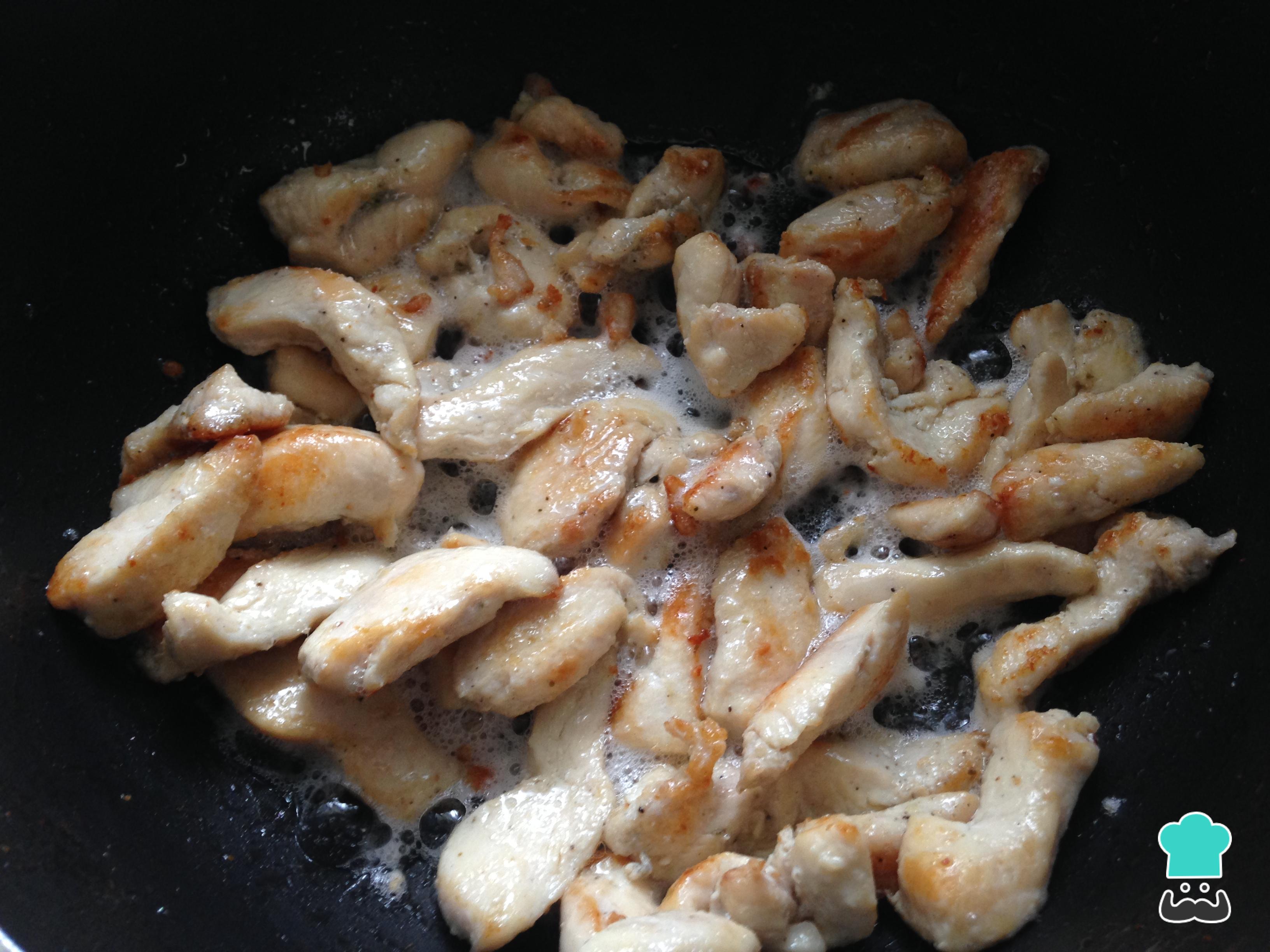 Em uma panela com um pouco de óleo, cozinhe as tiras de frango até ficarem douradas por fora e cozinhadas por dentro.