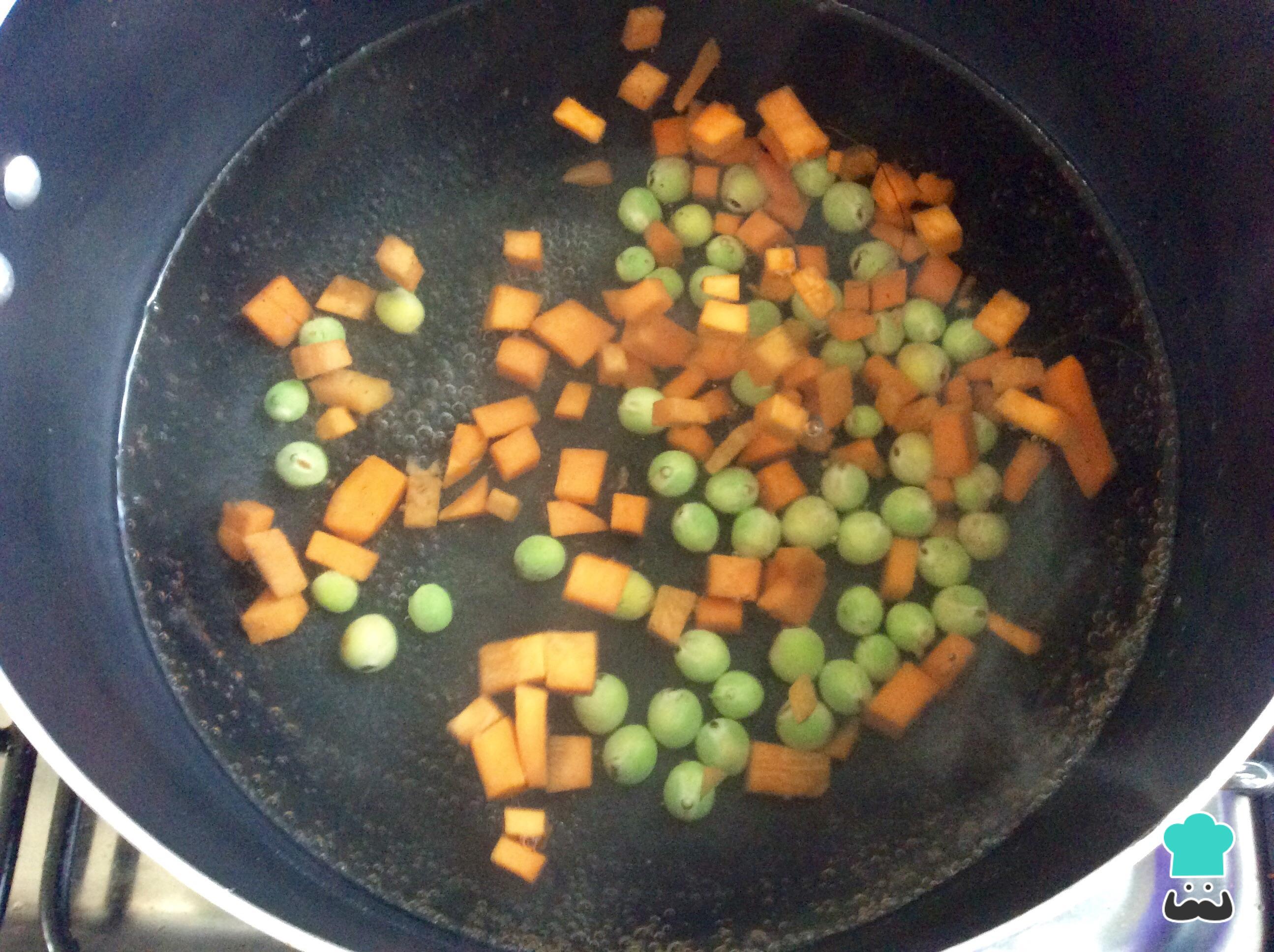 De igual forma cozinhe a cenoura e as ervilhas em uma panela com água e sal, durante 5 minutos.