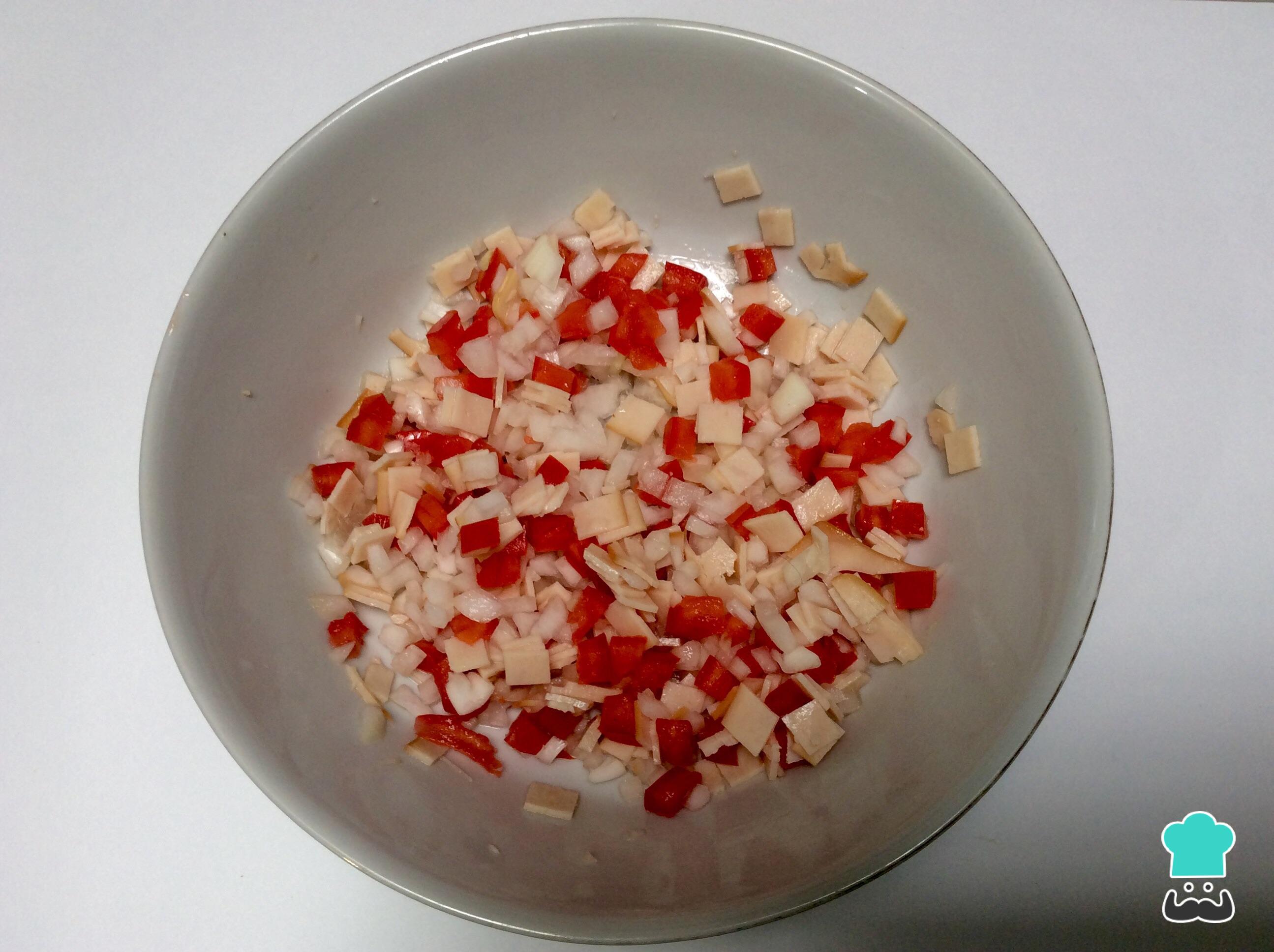 Pique em cubos pequenos a cebola, o tomate e o presunto, coloque-os na tigela onde irá servir a salada salada campeira tradicional.