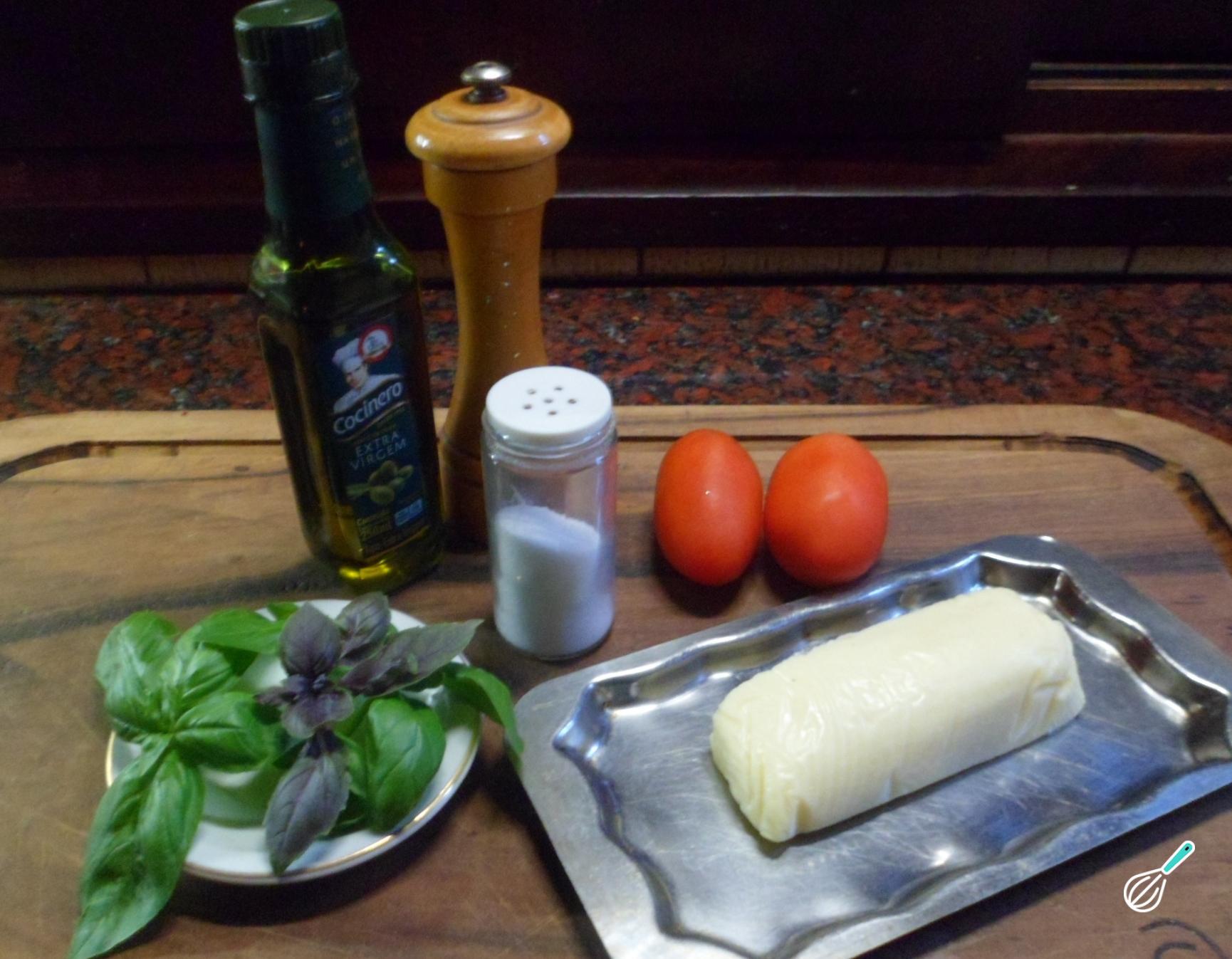 Para fazer esta salada caprese deve começar por juntar todos os ingredientes.