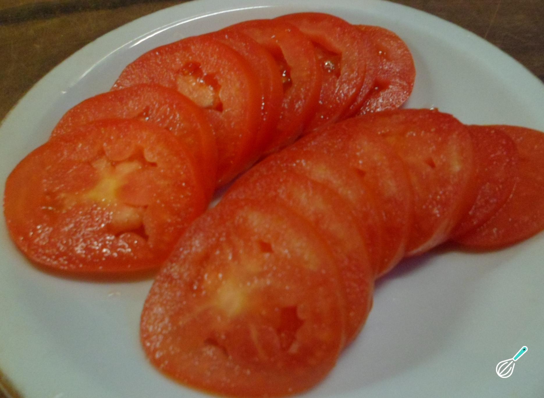 Corte os tomates em rodelas, nem muito finas nem muito grossas, e reserve.