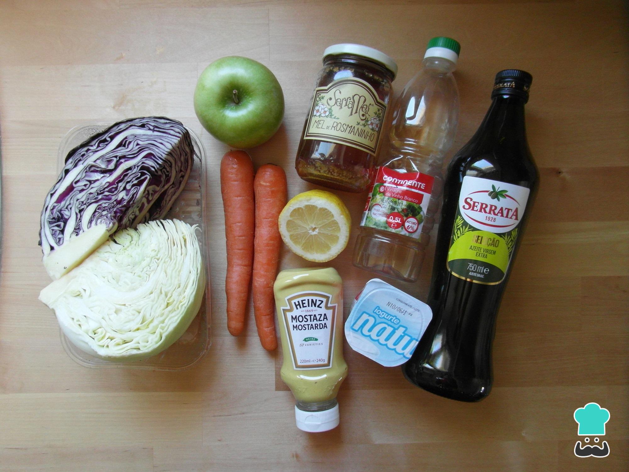 Para preparar esta saborosa salada coleslaw light, comece por reunir os ingredientes necessários.