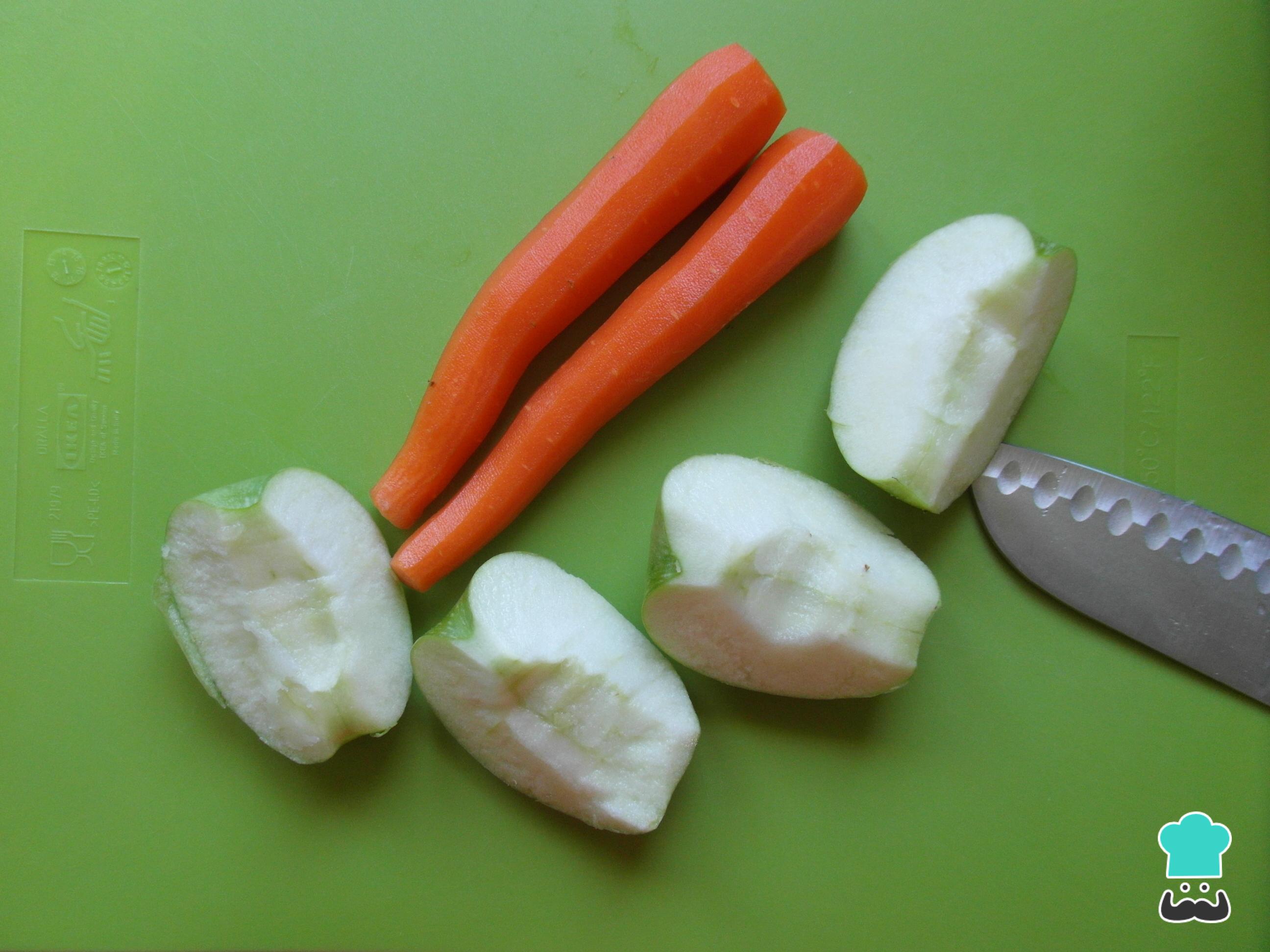 Descasque as cenouras e rale-as no sentido do comprimento. Lave as maçãs, retire a parte central, corte em rodelas e depois em tiras finas.