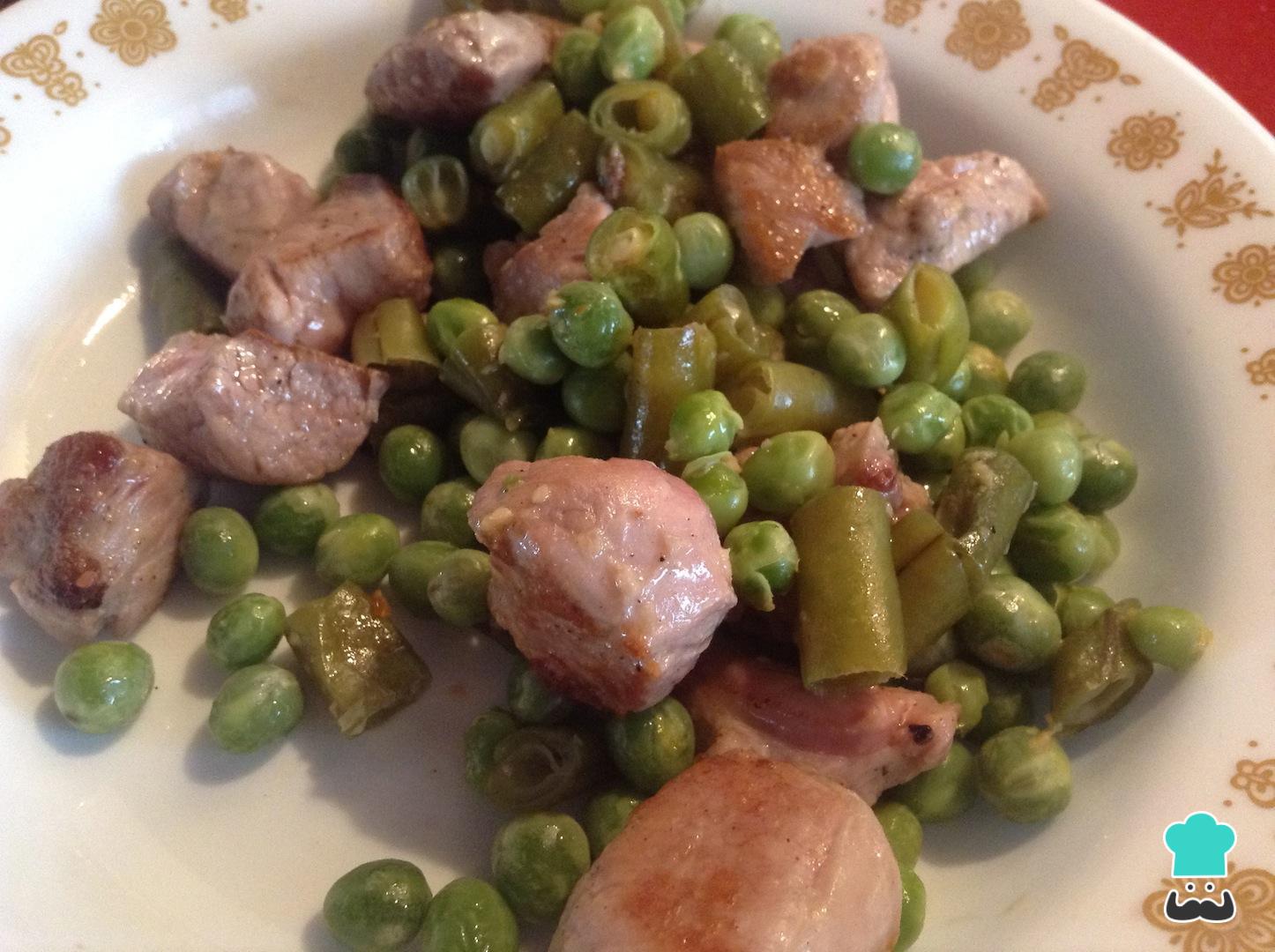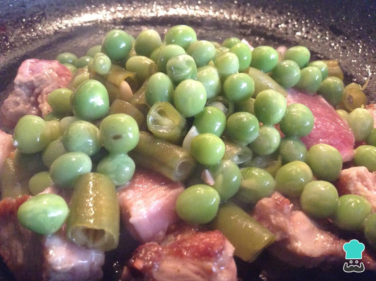 Assim que a carne estiver refogada, junte as ervilhas e o feijão previamente cozidos. Deixe fritar mais por alguns minutos e desligue o fogo.