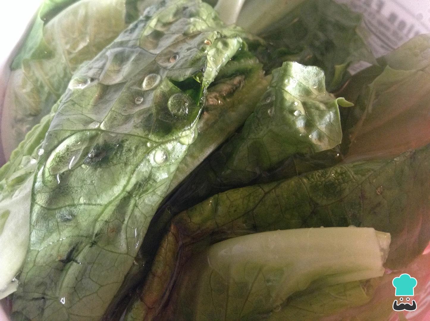 Coloque a alface em uma tigela com bastante água e acrescenta o suco de um limão ou um pouco de vinagre para desinfectar. Deixe descansar por 5-10 minutos. Remove a alface da água e deixe escorrer bem.