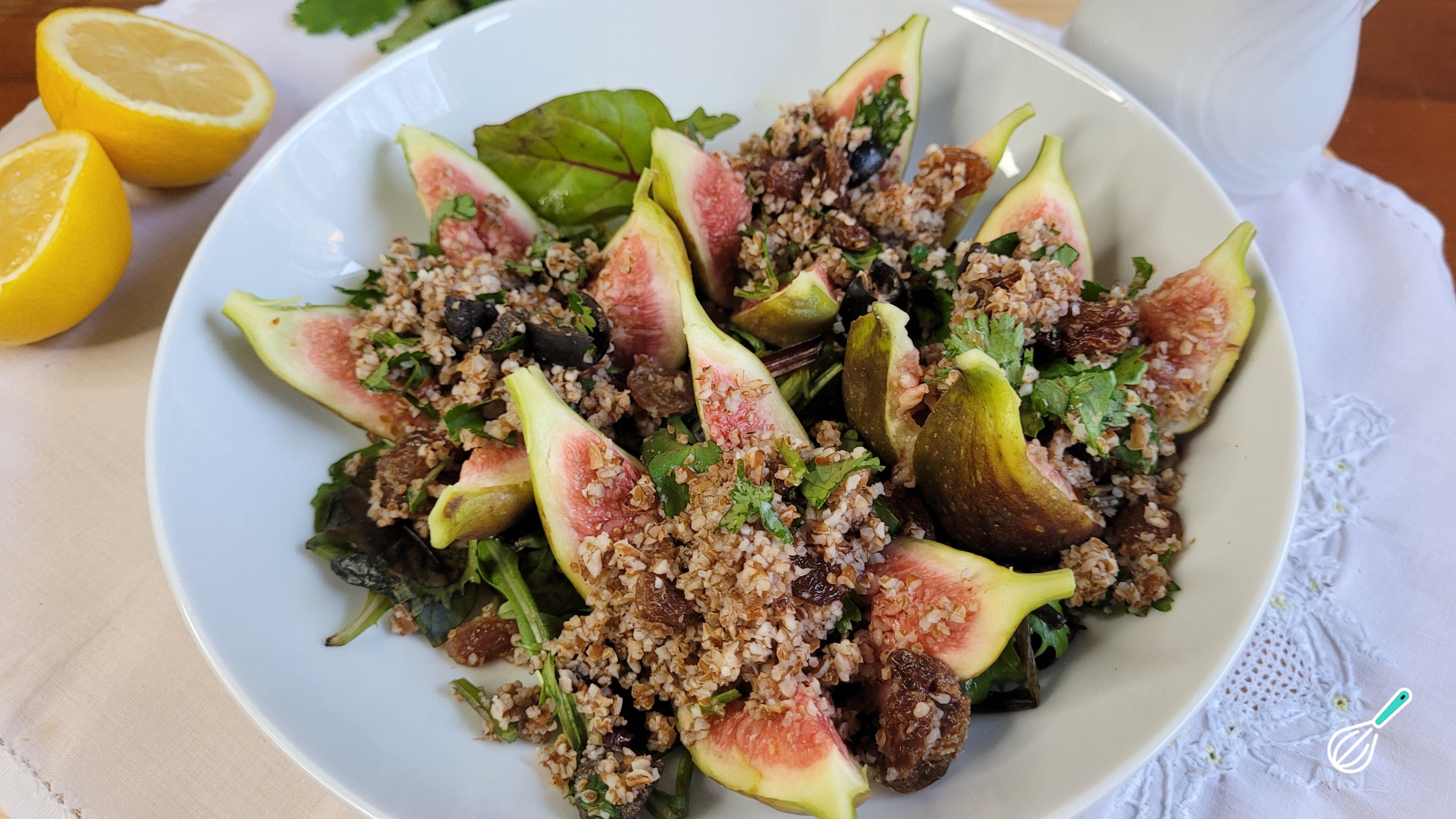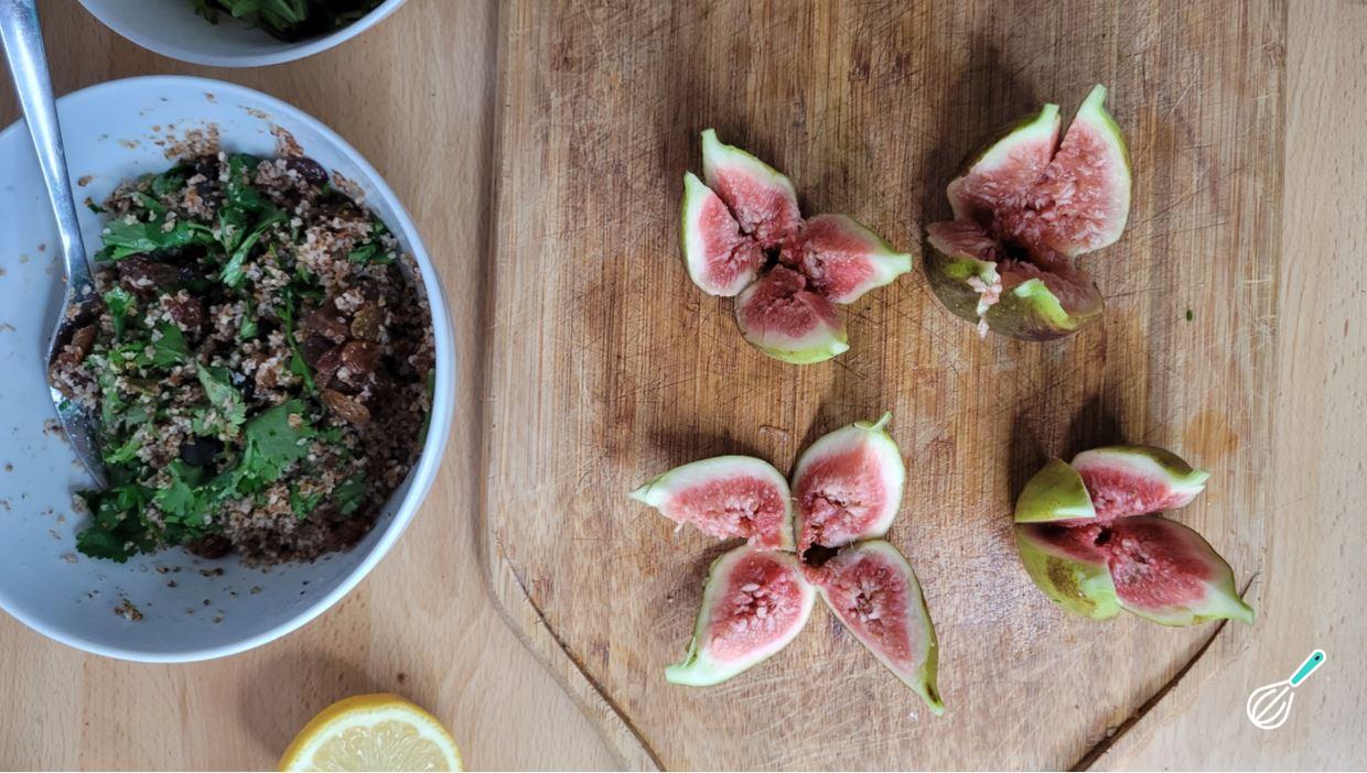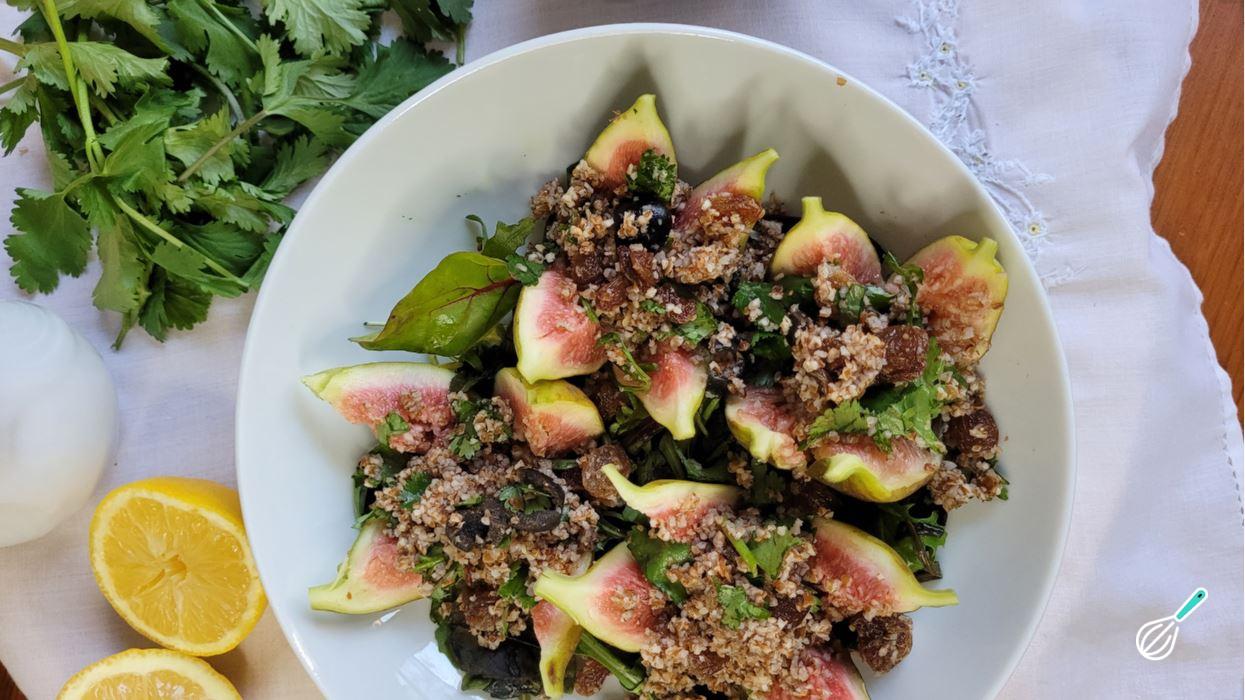 Esta salada com figo e trigo para quibe é inspirada em saladas de trigo com figo que são uma tradição muito antiga no mediterrâneo. Fica surpreendente e usar o trigo para quibe deixa tudo ainda mais fácil, porque não precisa de fogão, basta hidratar o quibe com água quente e em poucos minutos você tem uma refeição completa na sua casa, com a doçura suave dos figos, o frescor do coentro e a acidez do limão.