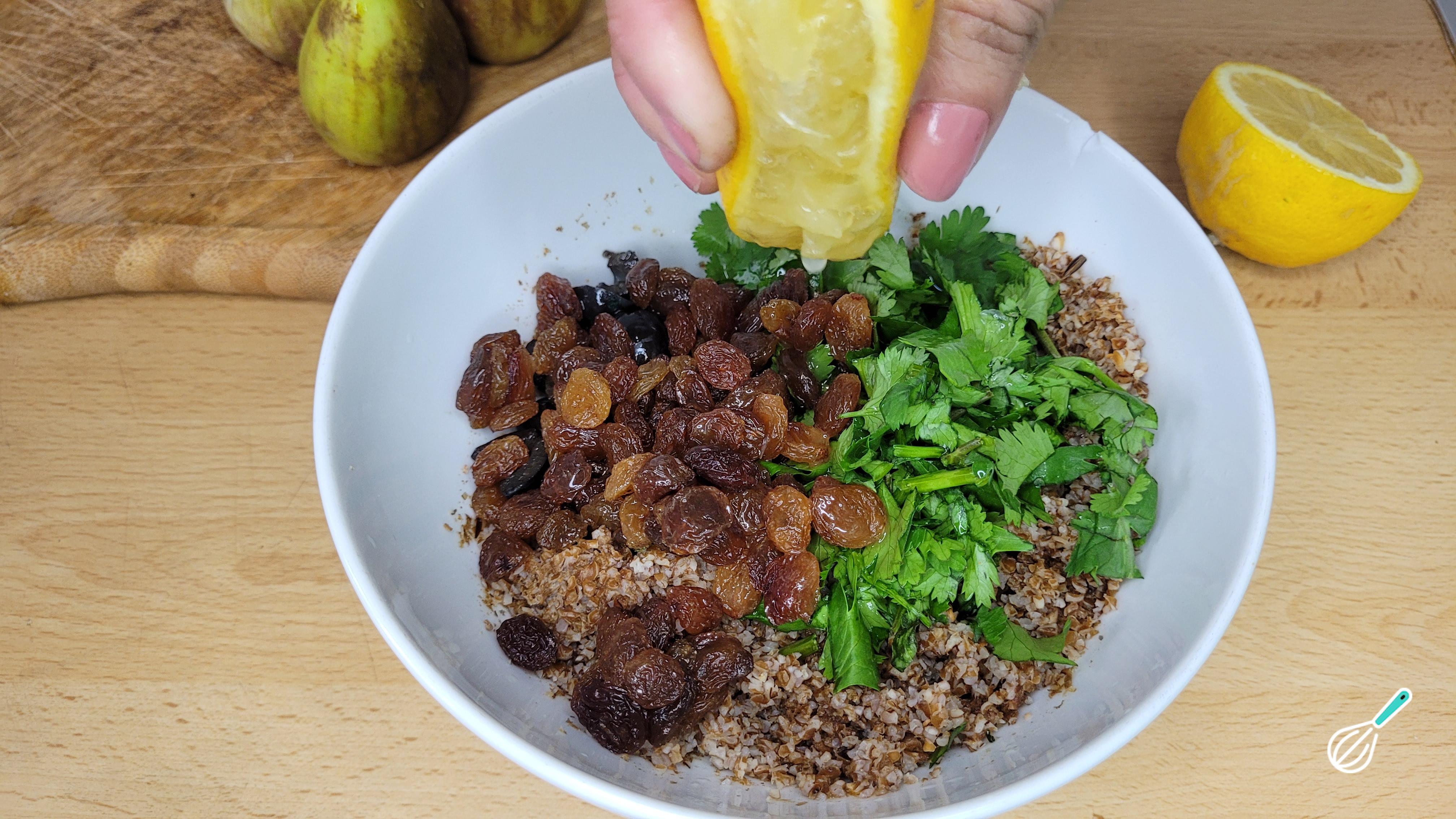 Misture o coentro picado, as azeitonas cortadas e as passas ao trigo já hidratado. Regue com o suco do limão e o azeite.