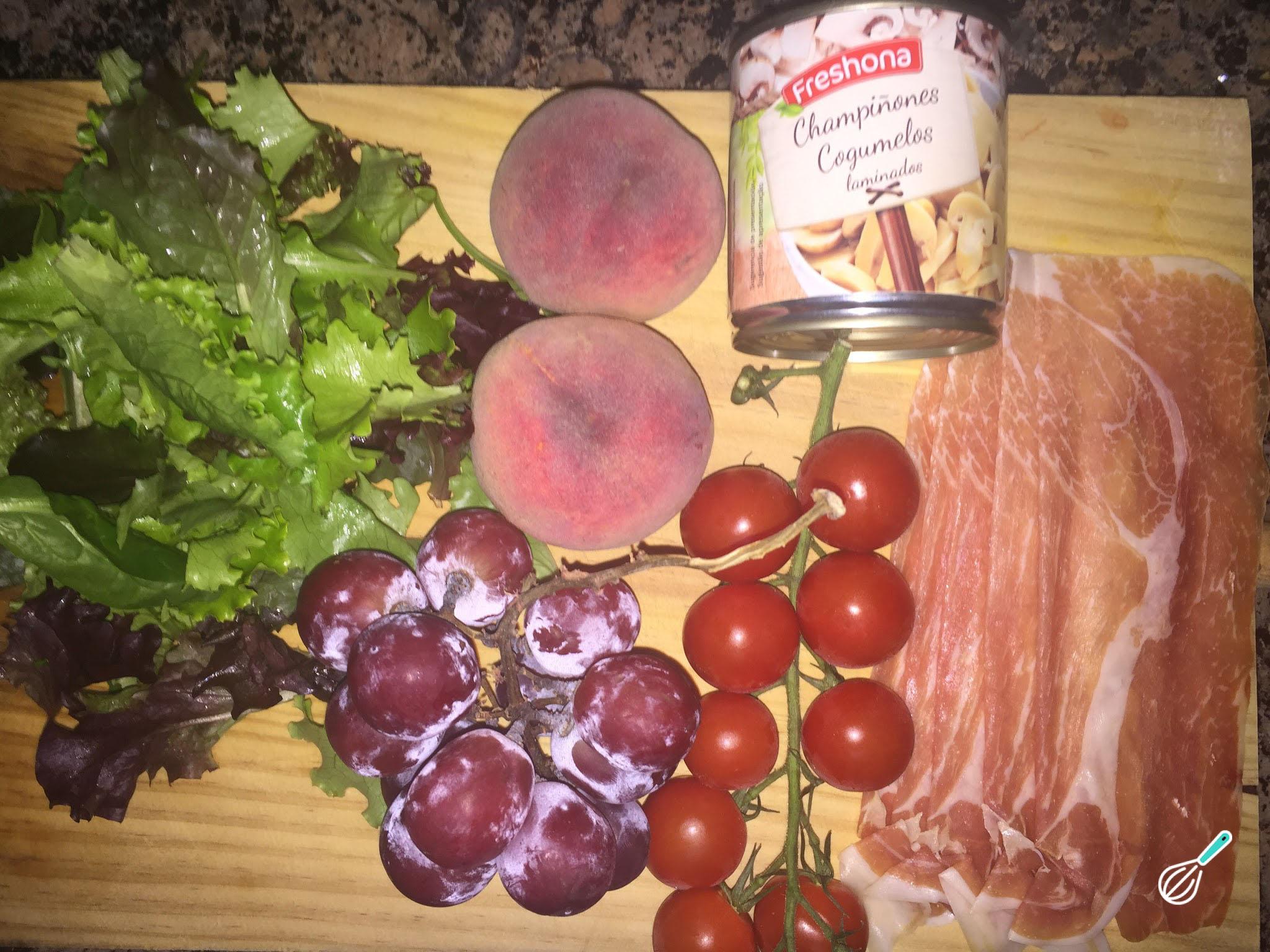 Comece esta salada com frutas e presunto, juntando todos os ingredientes necessários.