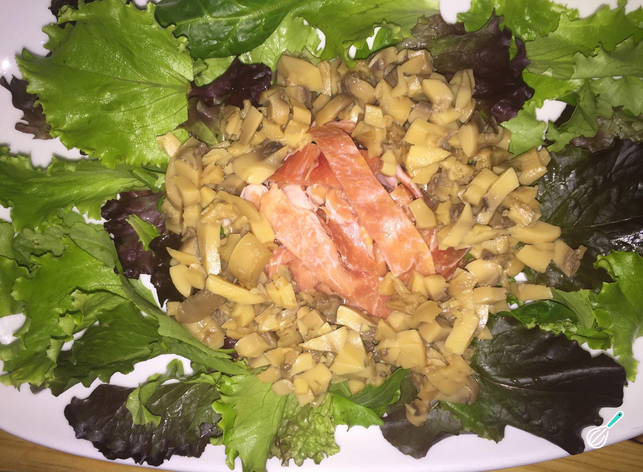 Pique os cogumelos e o presunto. De seguida disponha em uma travessa a mistura da alface e sob o meio coloque o presunto picado e os cogumelos.