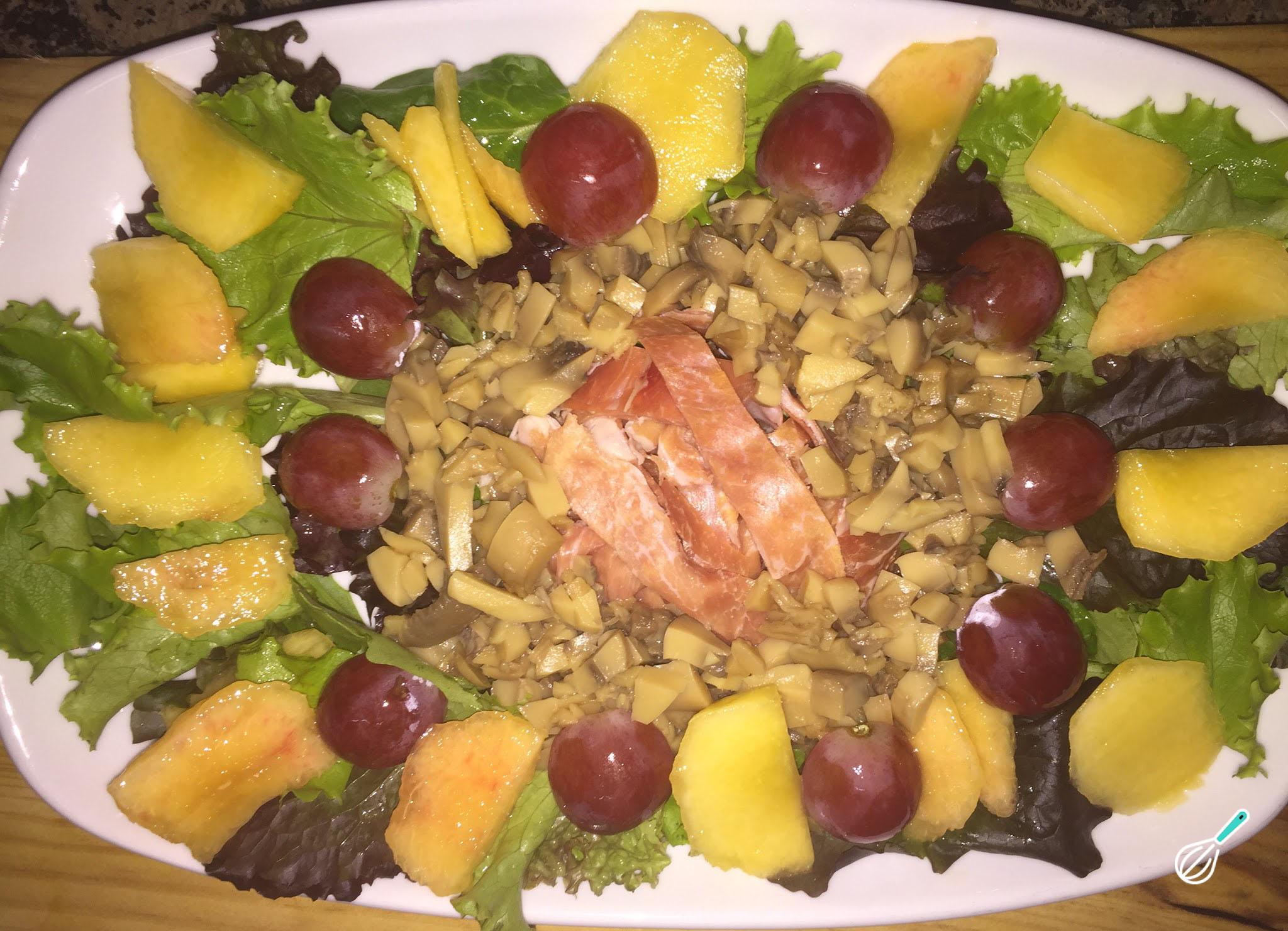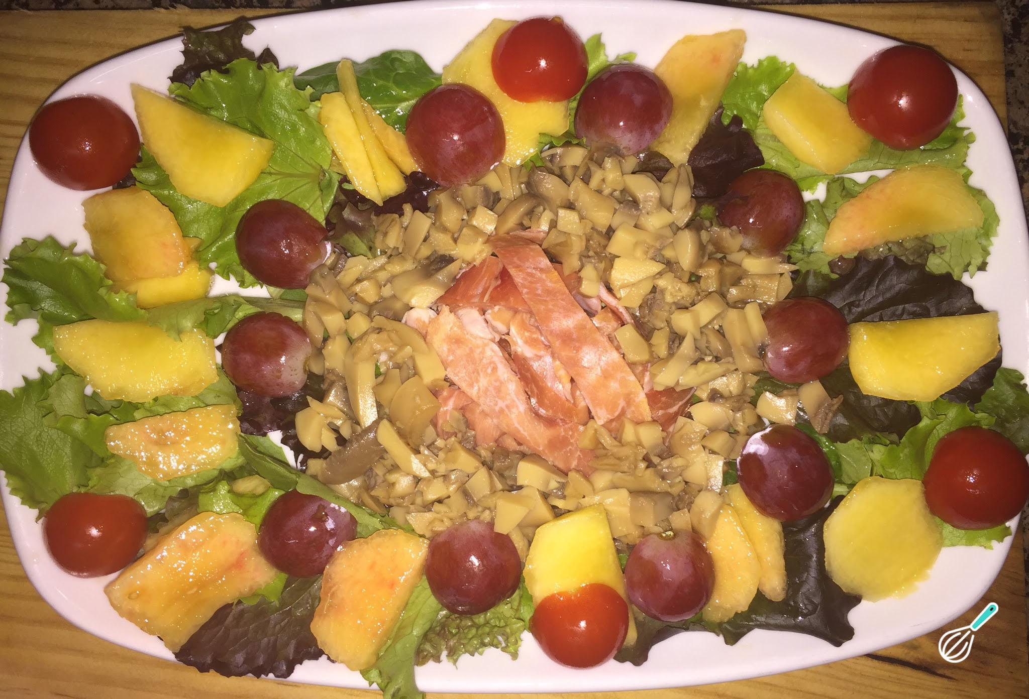 Existem saladas que são uma autêntica maravilha, e esta salada com frutas e presunto é uma delas! Esta salada pode servir de acompanhamento ou de prato principal, como tem bastante proteína, ficará muito satisfeito se optar para prato principal. Também faço muitas vezes esta salada quando tenho festas em casa, porque é uma salada colorida e deliciosa, agrada sempre a todo mundo. Eu usei como frutas o pêssego e as uvas, mas você pode usar outras frutas.