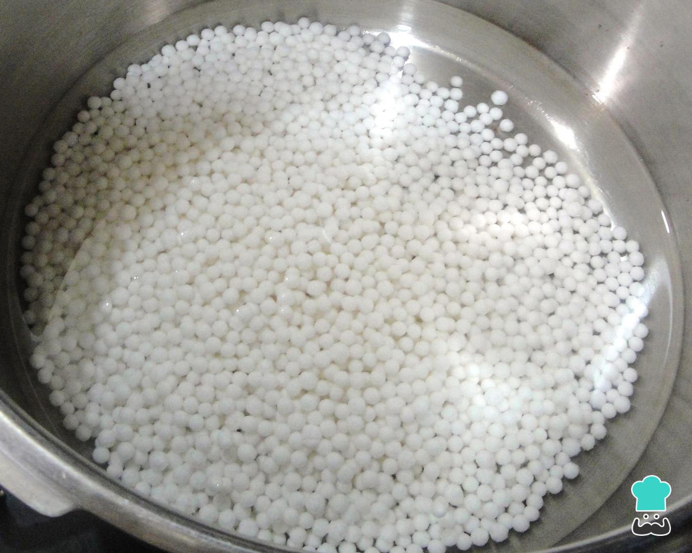 Primeiramente enxague o sagu até a água sair transparente. Coloque o sagu numa tigela, acrescente 1 xícara de água em temperatura ambiente e deixe hidratando durante toda a noite (aproximadamente 8 horas).