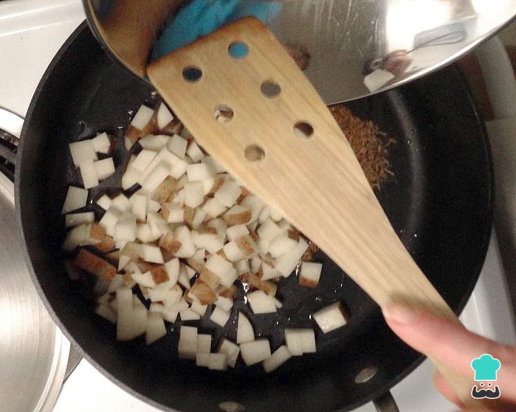 Leve ao fogo uma panela com o óleo ou manteiga ghee e esquente os grãos de cominho por uns segundinhos, para ativar o seu sabor. Depois adicione a batata, misture e deixe por 3-4 minutos.