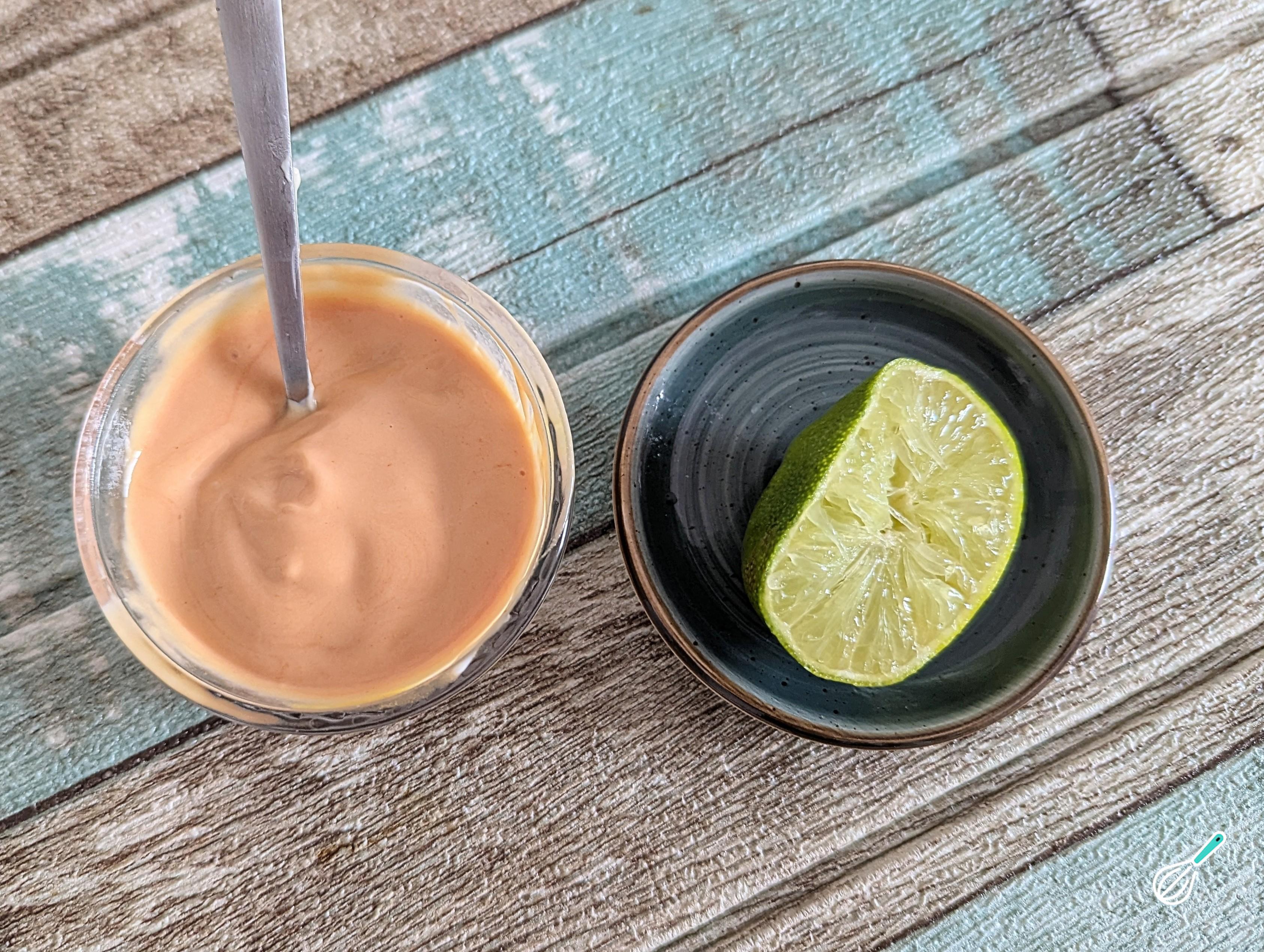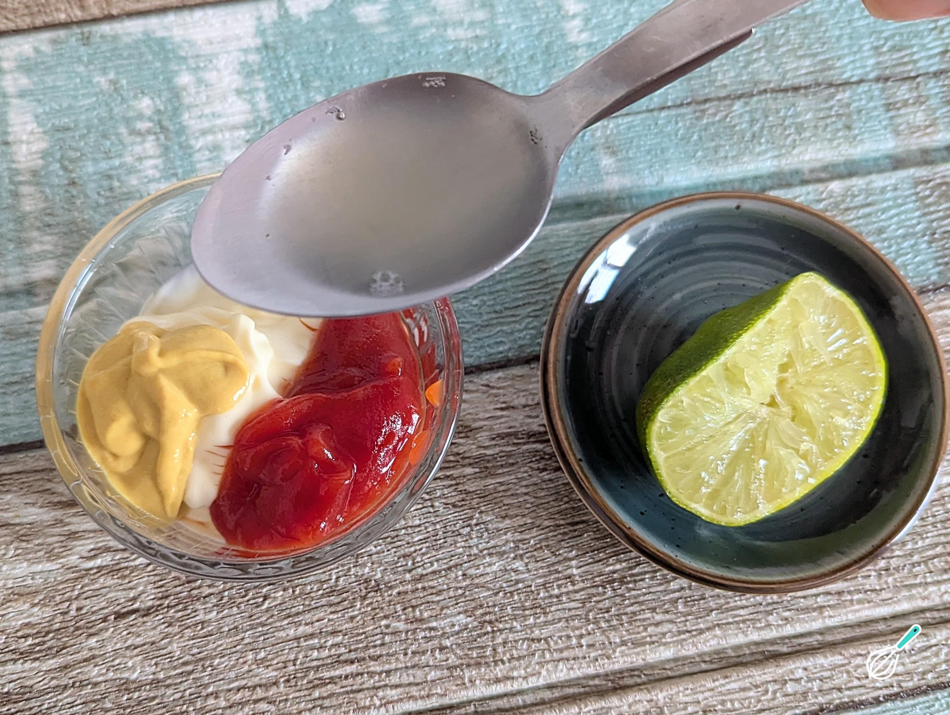 Em um recipiente pequeno, misture bem a maionese, o ketchup, a mostarda e o limão (que ajuda a equilibrar os sabores e trazer frescor ao molho). Tempere com sal e pimenta se achar necessário.
