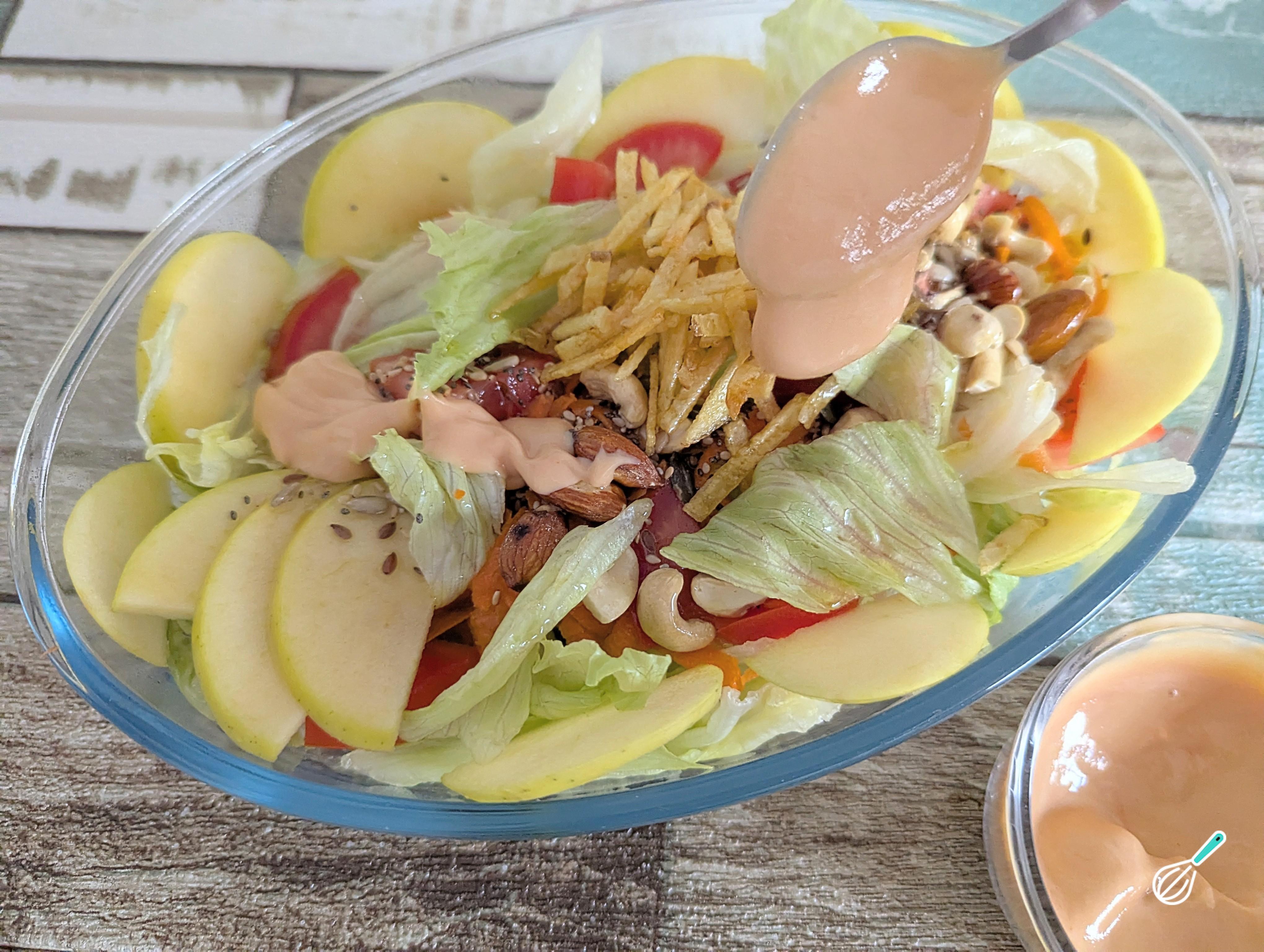 A salada crocante ao molho rosé é uma combinação perfeita de texturas, cores e sabores. Refrescante e leve, ela traz o equilíbrio ideal entre vegetais frescos, ingredientes crocantes e um molho cremoso com um toque levemente adocicado.