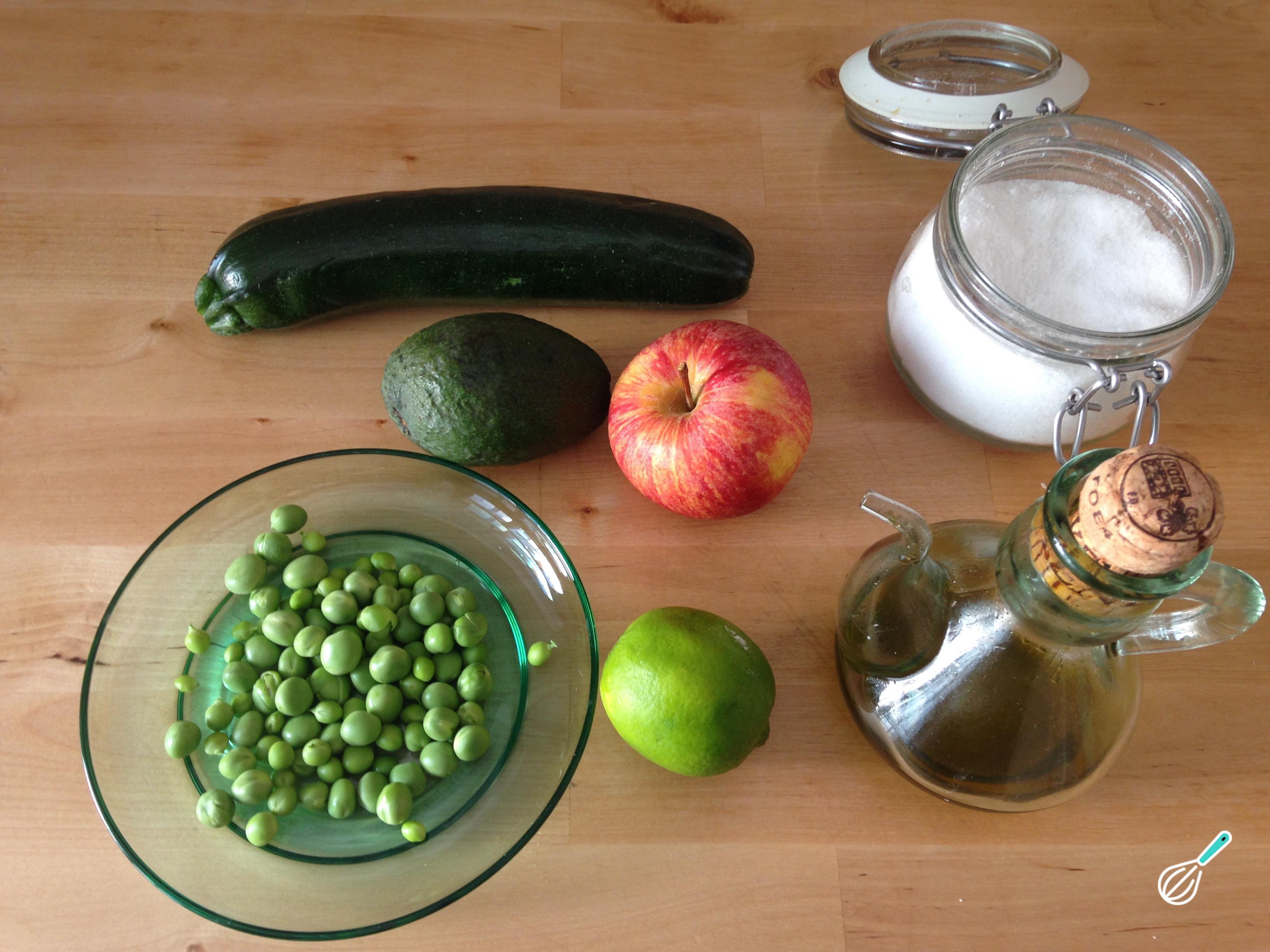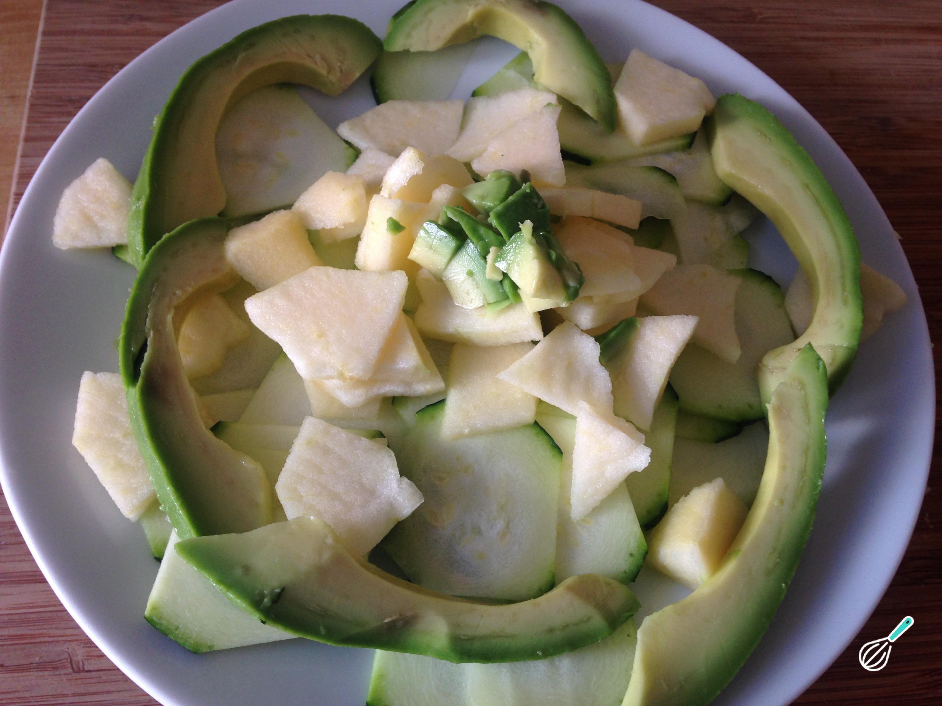 Distribua a abobrinha, a maçã e o abacate pelo prato. Adicione as ervilhas frescas. Se não encontrar as ervilhas frescas, que você pode usar ervilhas congeladas.
