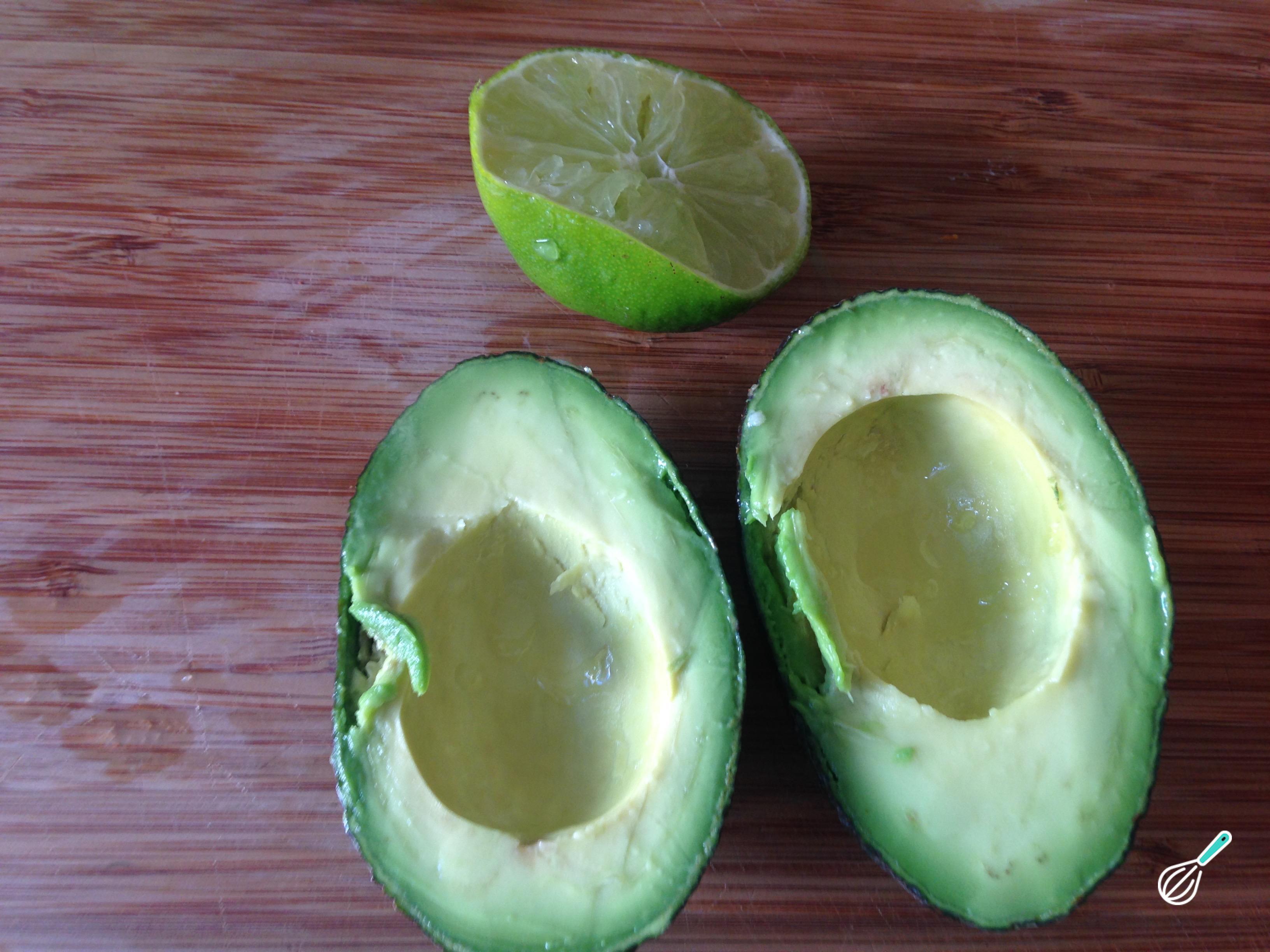 Corte o abacate ao meio, retire o caroço do centro e adicione algumas gotas de limão para que não oxide. Retire a pele e corte em tiras finas.
