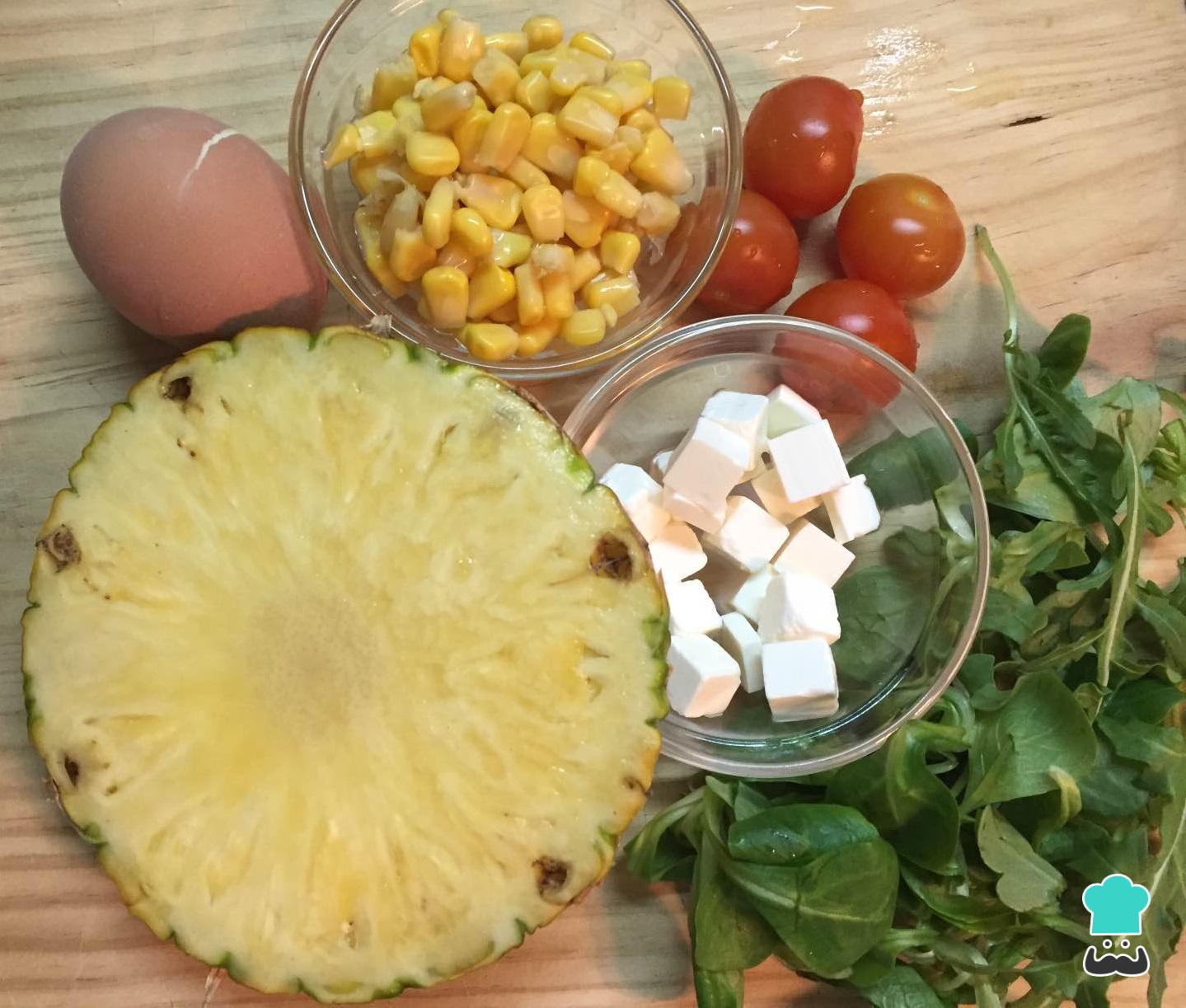 Comece por juntar todos os ingredientes necessários para a salada de abacaxi.