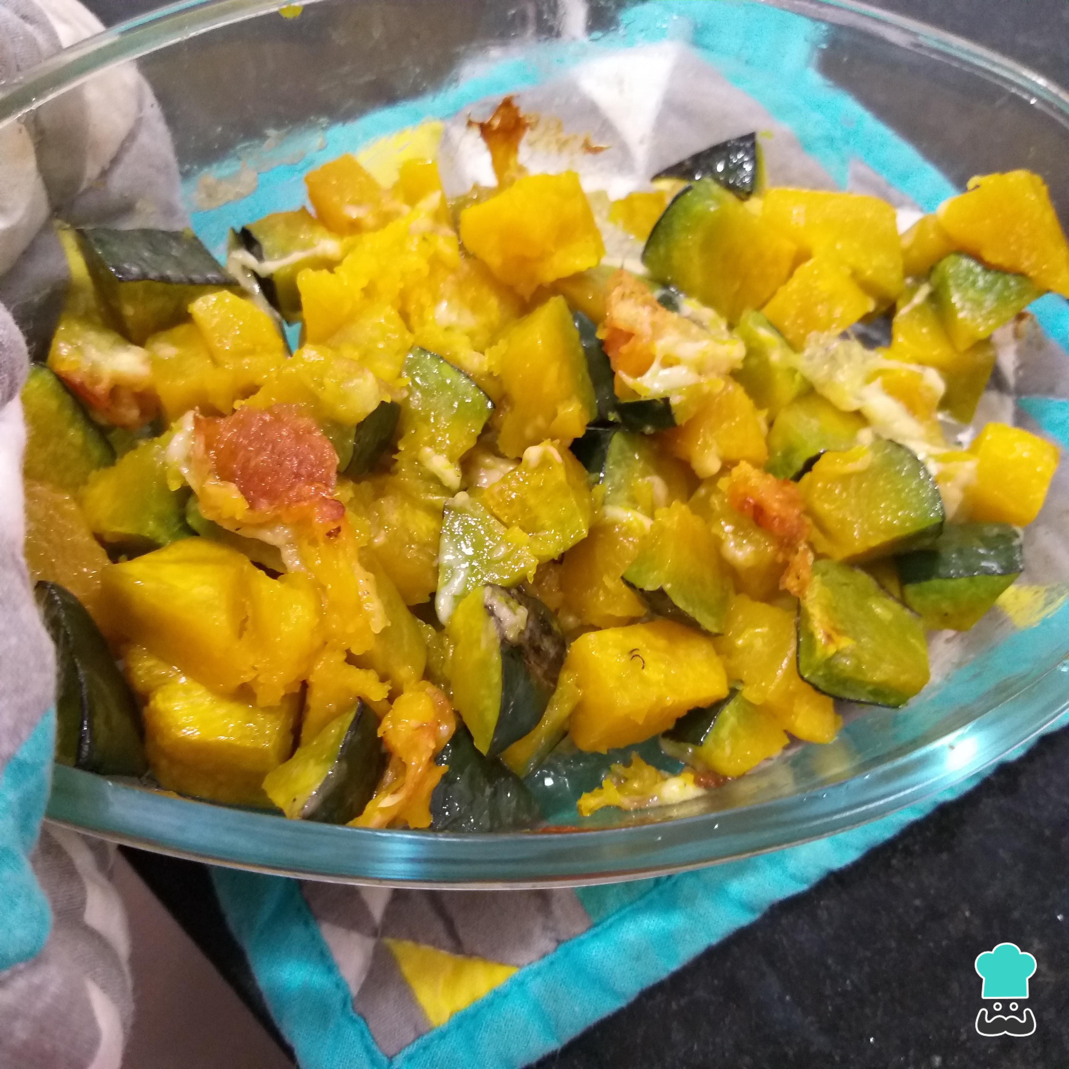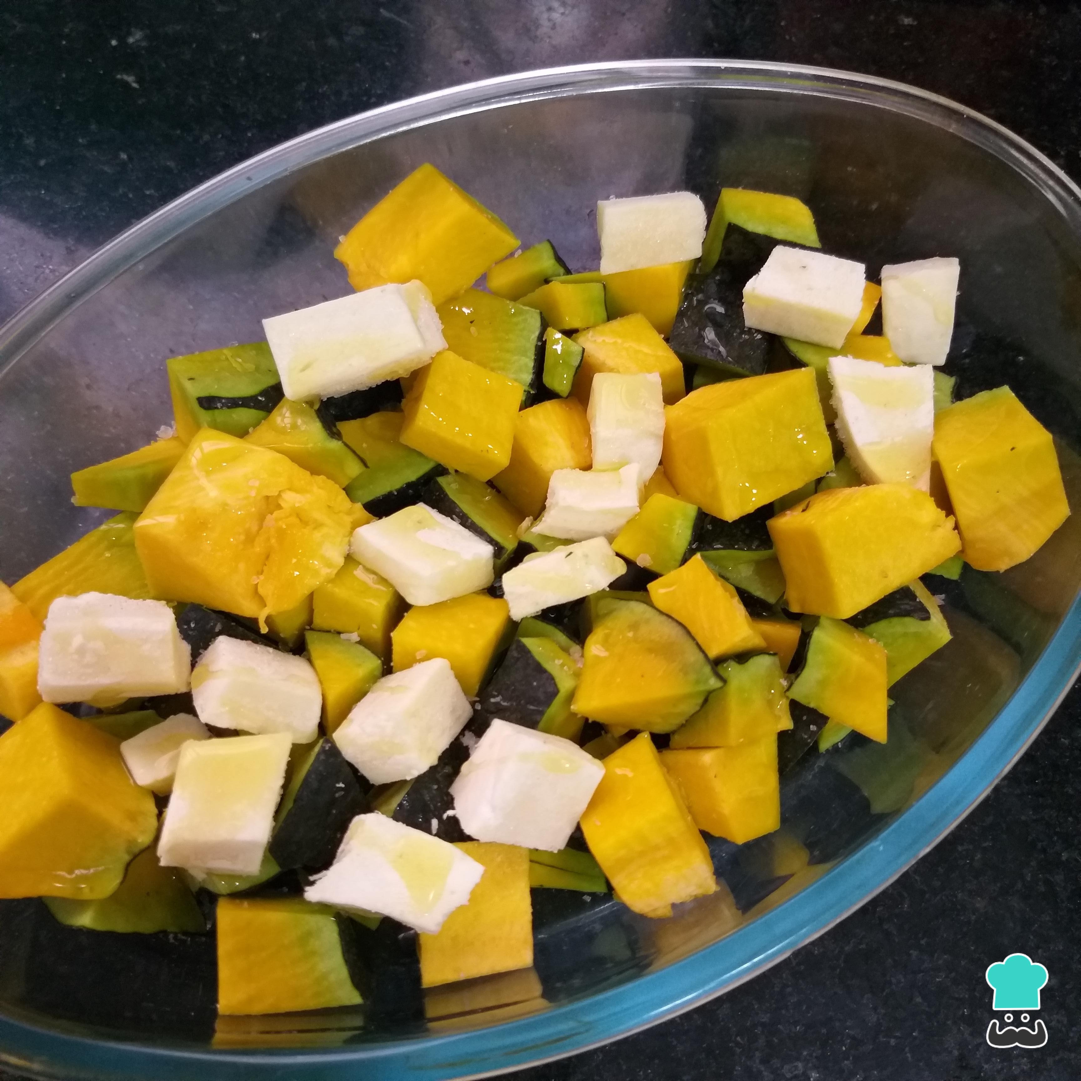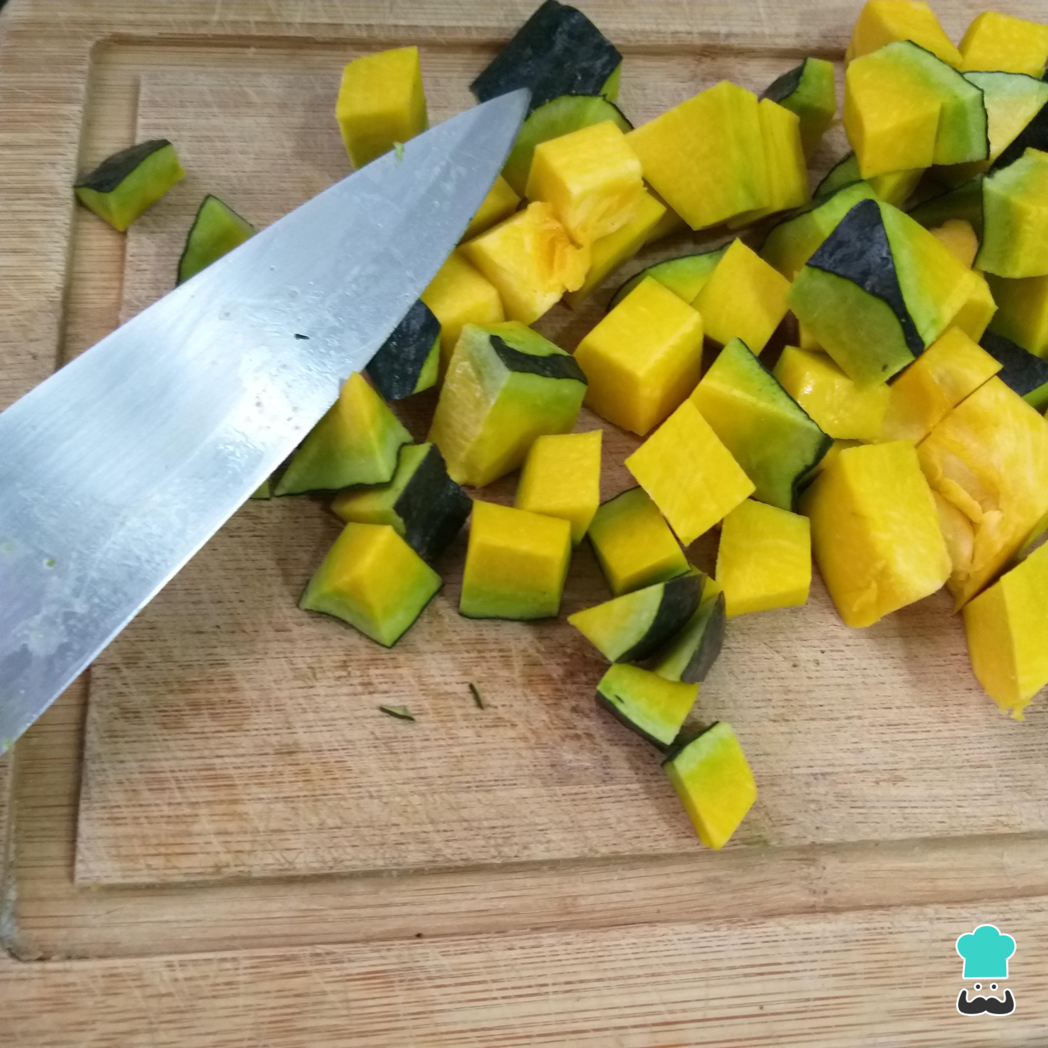 Corte a abóbora em fatias e depois em cubos pequenos (no máximo 2 cm). Não é necessário descascá-la.