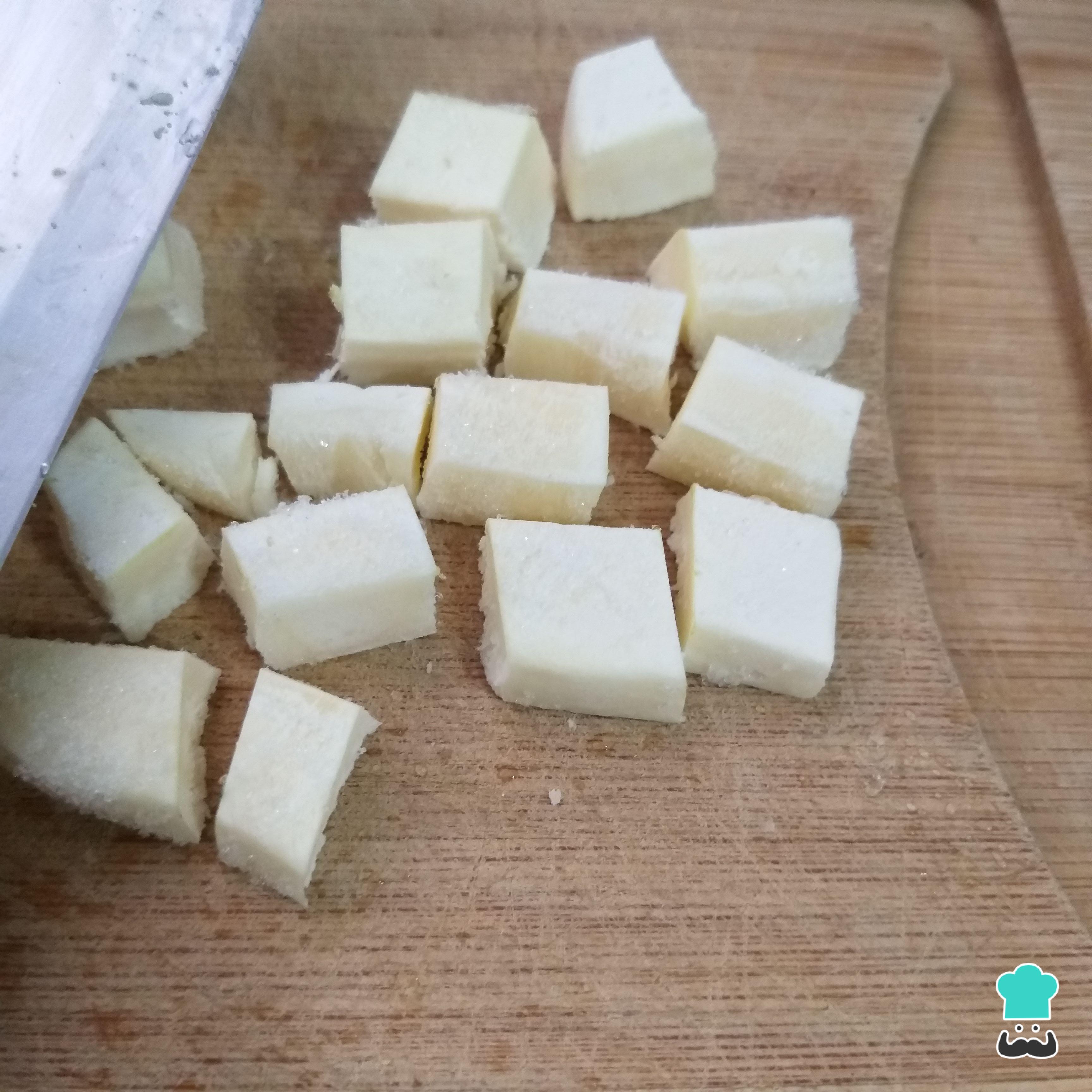 Separe um pedaço de queijo muçarela e corte em cubos do mesmo tamanho da abóbora.