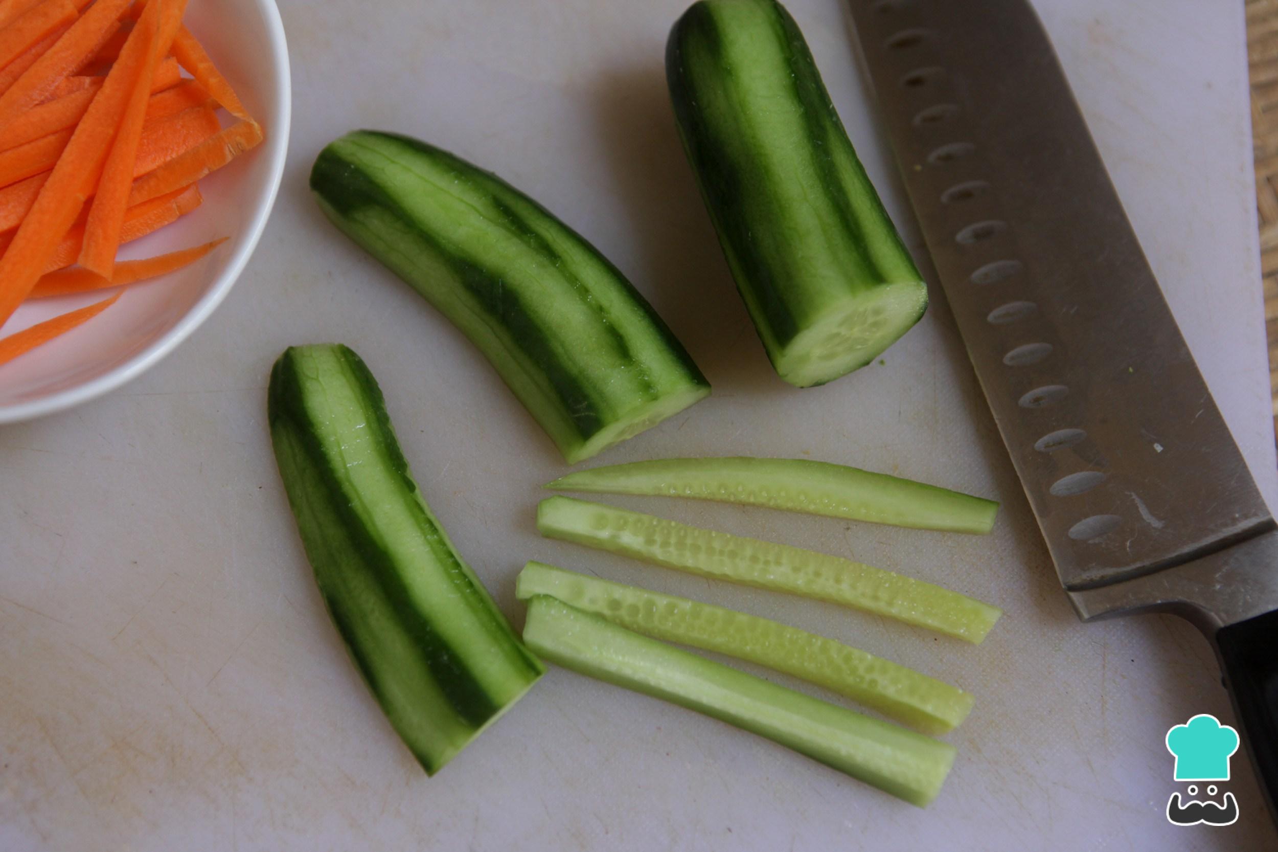 O primeiro passo desta receita é preparar os legumes: corte a acelga, a cebola e o pimentão em tiras finas, o pepino e a cenoura em palitos finos, corte os cogumelos em lâminas mais ou menos finas e pique os alhos.