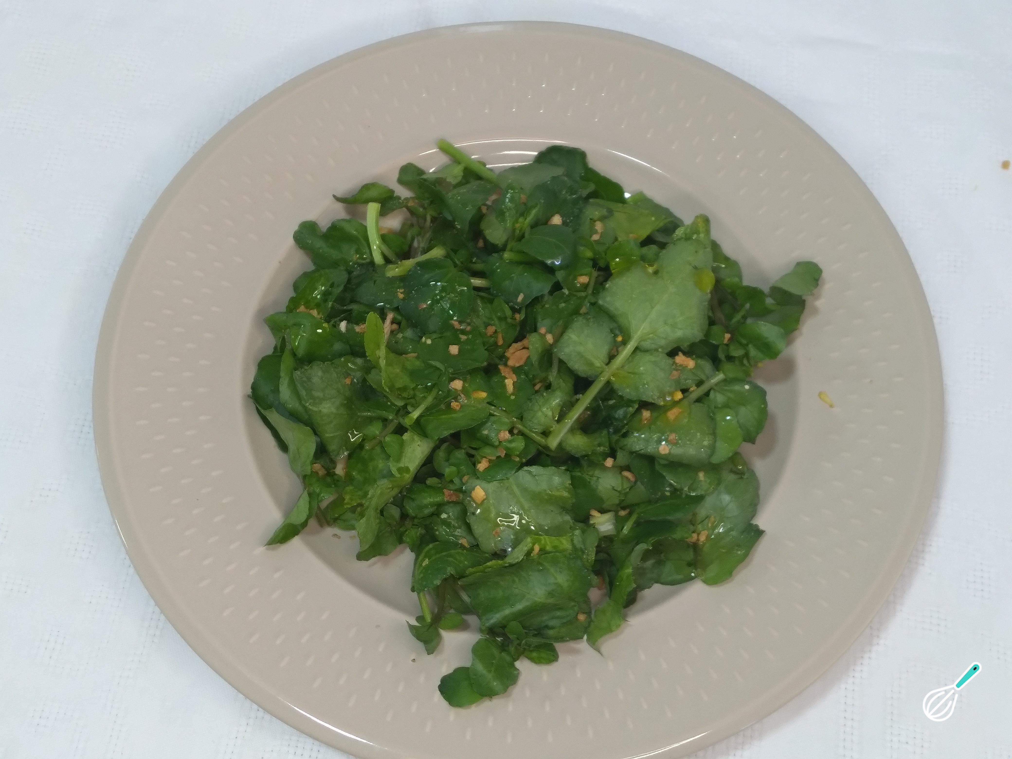Em um prato, coloque o agrião, azeite e os temperos. Acerte o sal.