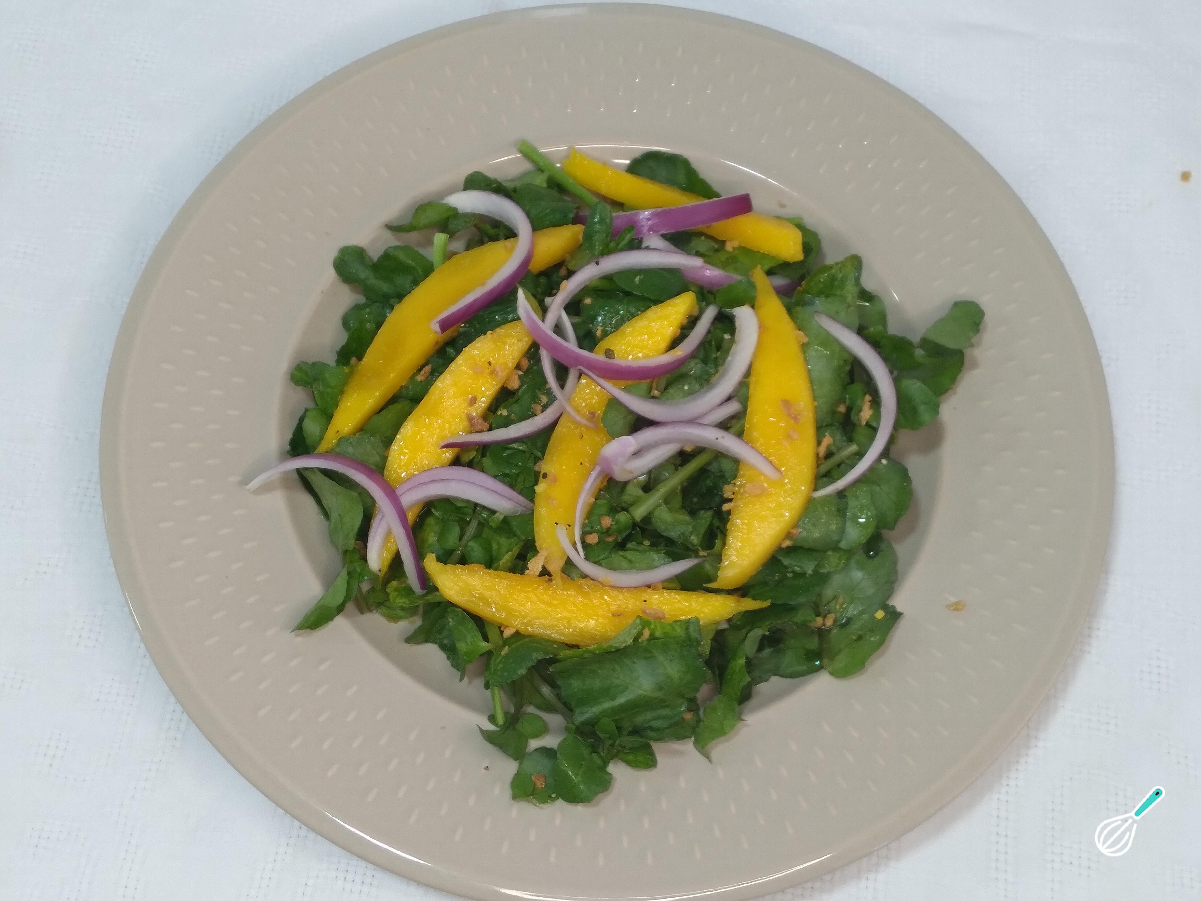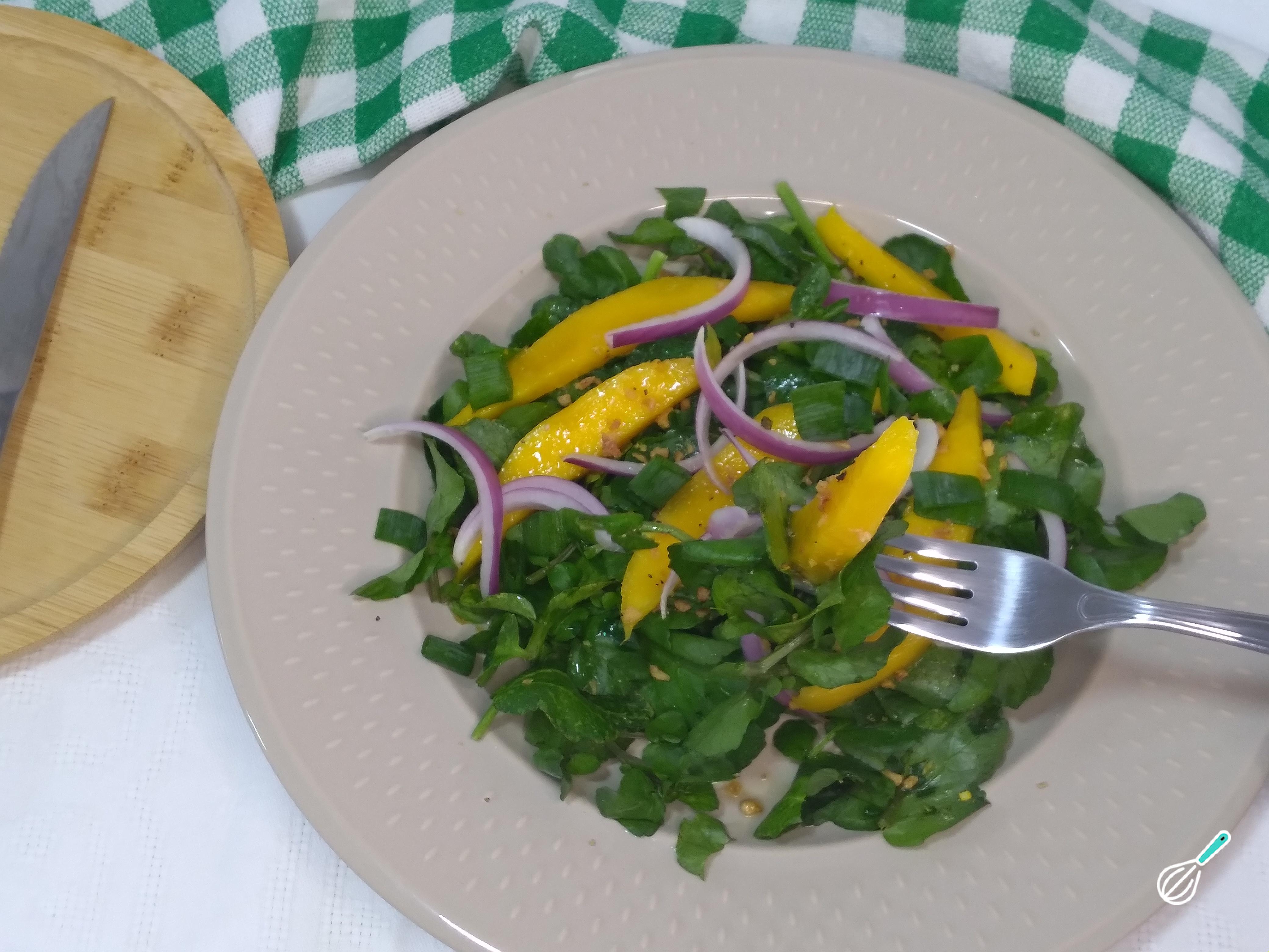 Saladas são uma delícia. Seja ela quente,fria,com legumes,com folhas e até com frutas. Geralmente a combinação de folhas com frutas não decepciona e a salada de hoje é a combinação do ardido do agrião, com a doçura da manga e da cebola roxa.