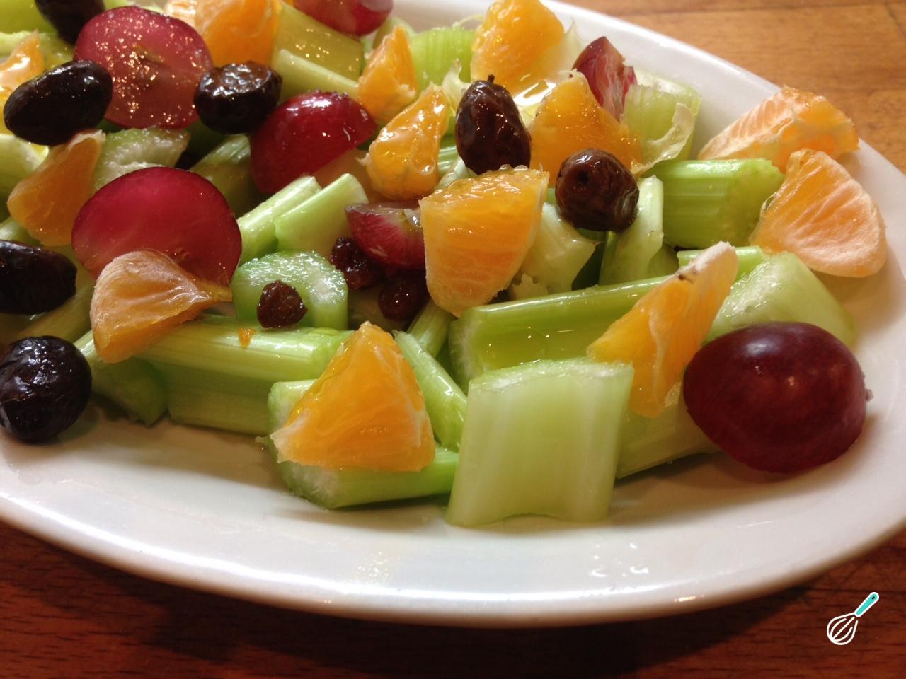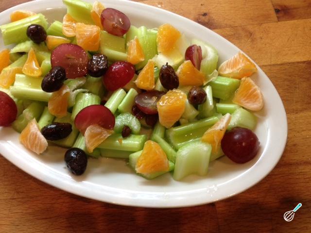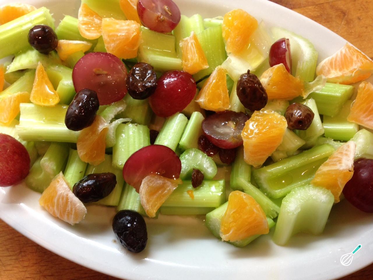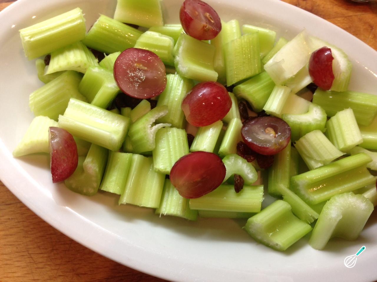 Primeiro lave os ramos de aipo, corte em pedaços e coloque no prato em que irá servir esta salada. Corte também as uvas ao meio e adicione ao prato, junto com as uvas-passa.