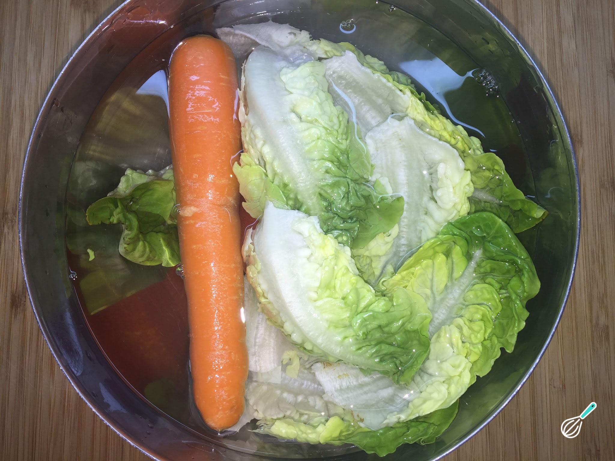 Higienize os legumes (alface, tomate e cenoura) colocando-os em uma tigela com água e umas gotas de limão ou vinagre por 10-15 minutos. Depois lave com água corrente e escorra.
