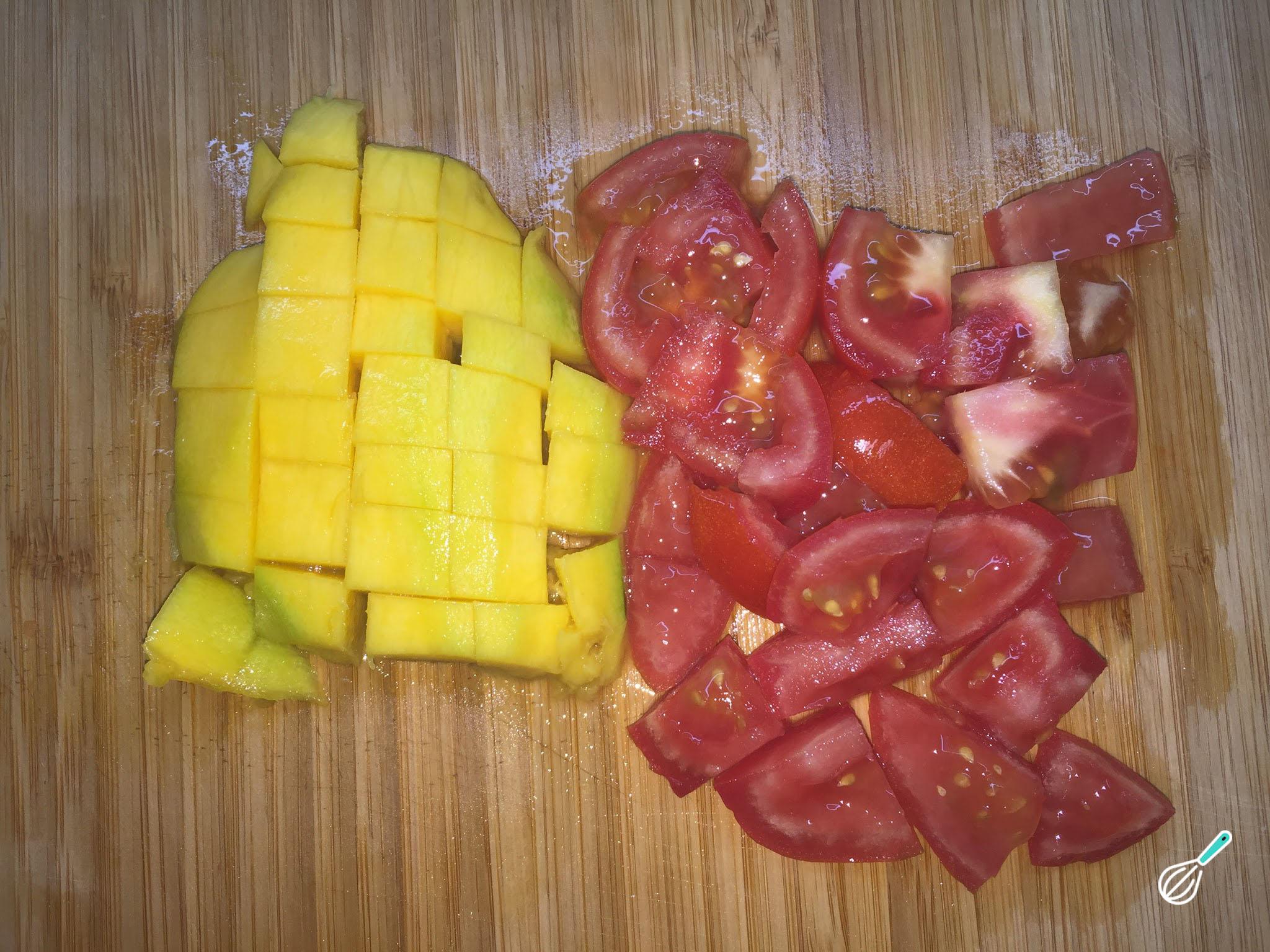 Pique o tomate e a manga descascada em cubinhos.