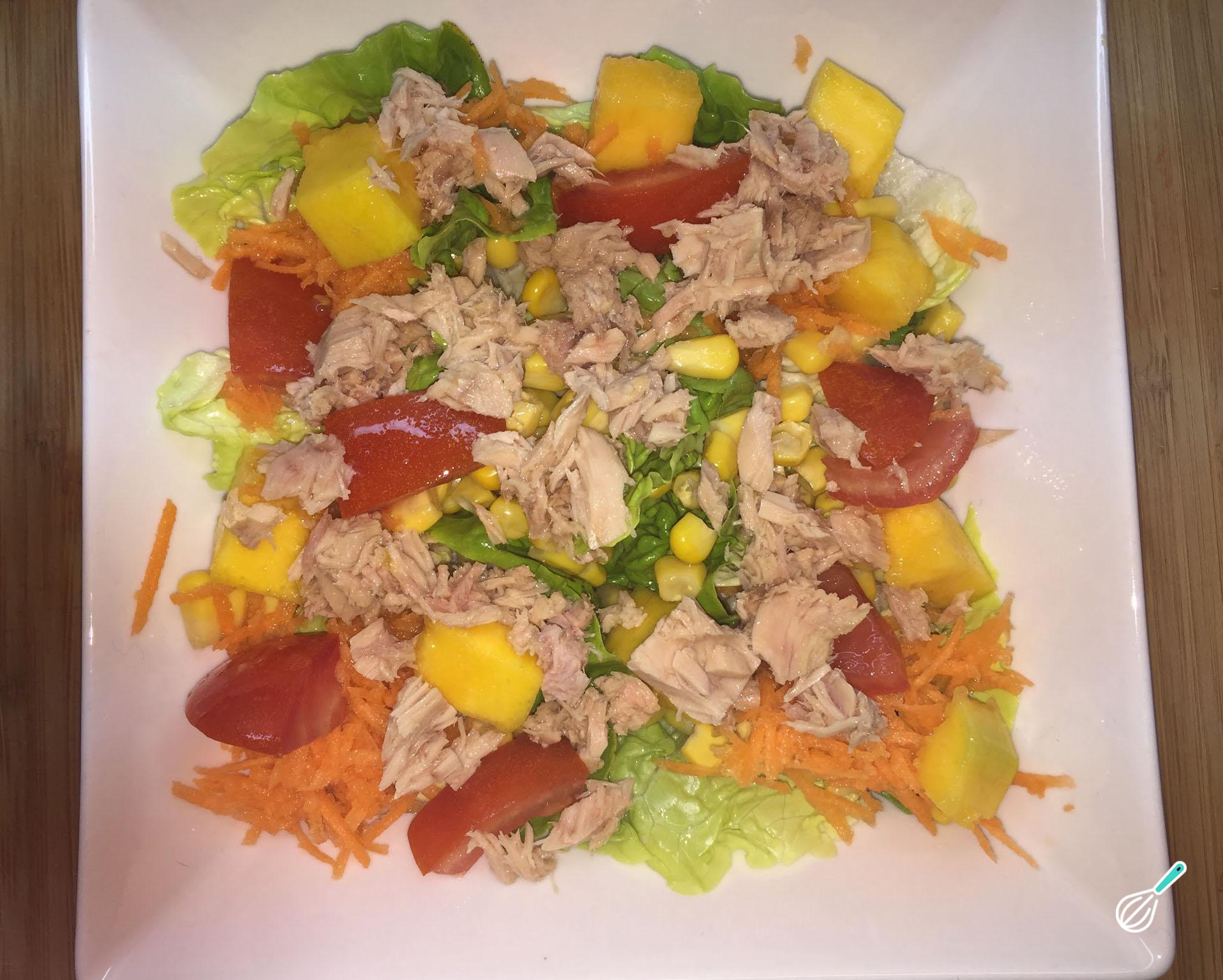 Junte à alface a cenoura ralada, o atum escorrido, o milho verde escorrido, o tomate e a manga e misture.