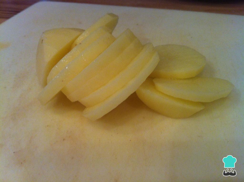 Dica: as rodelas não deverão ser muito grossas, para a batata não demorar muito a cozer, nem muito finas para não desmanchar.