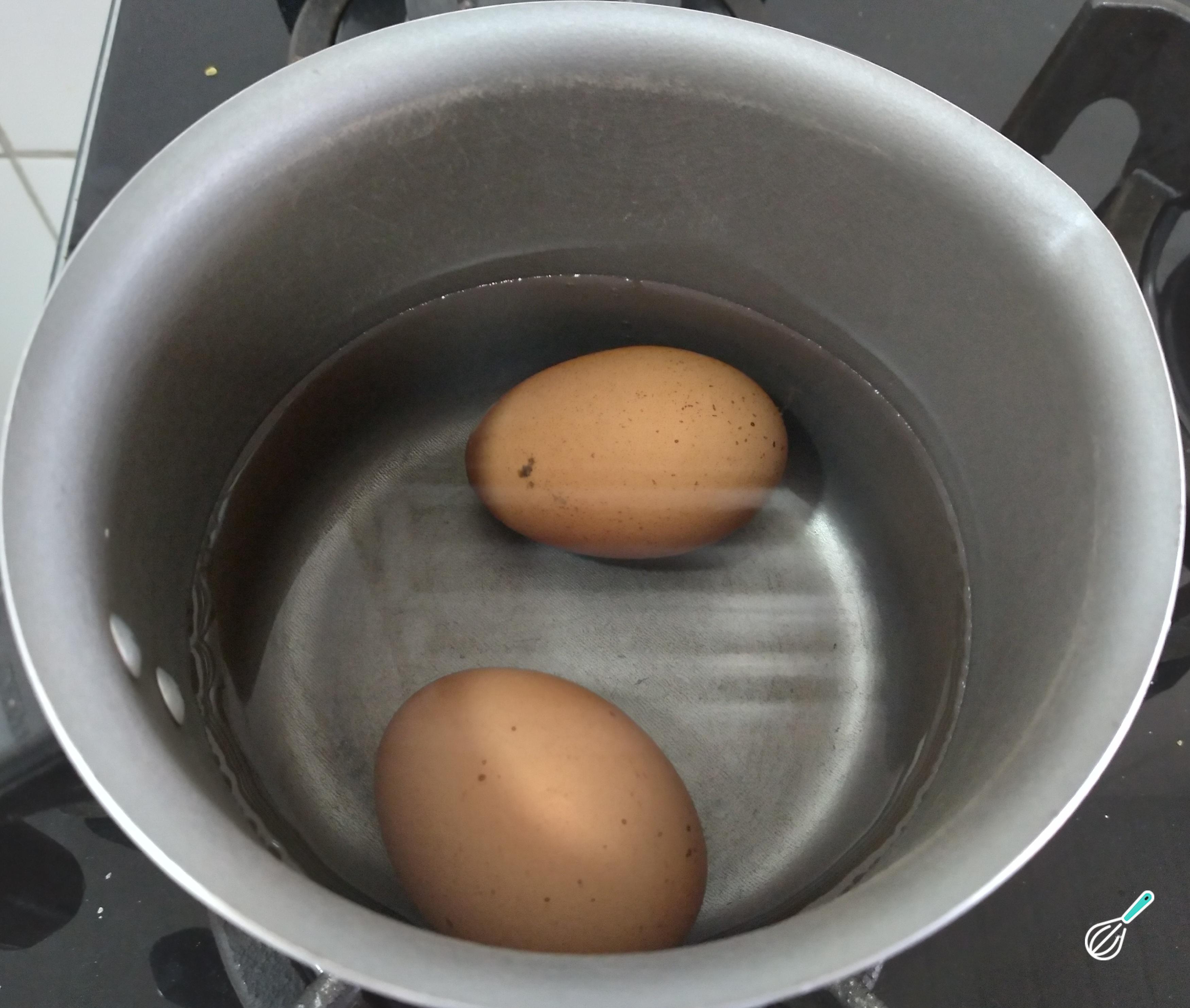 Comece cozinhando os dois ovos. Cozinhe por 10 min, assim que água começar a ferver. Os ovos devem ficar com a gema cozida para cortar e enfeitar a salada. Retire a casca dos ovos e reserve.