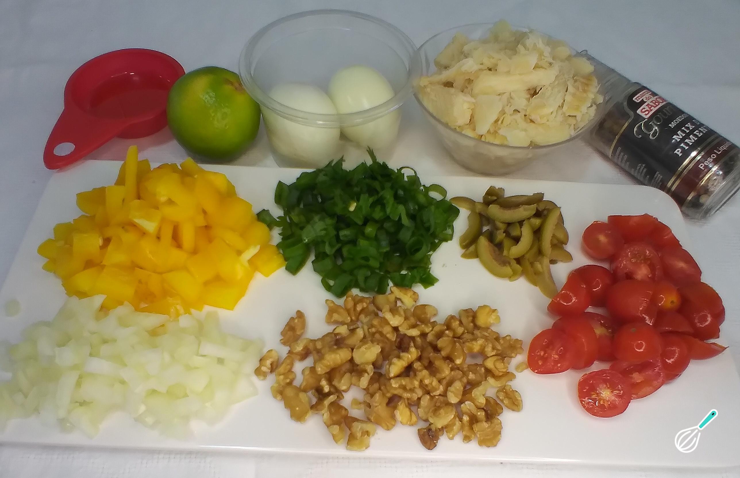 Depois de cozinhar os ovos, retire da água e deixe que eles esfriem. Em seguida, separe os ingredientes. É importante que o bacalhau esteja dessalgado e limpo para essa receita. Corte a cebola em cubinhos pequenos, os tomates em rodelas. Corte as nozes para que fiquem menores. Assim ficarão mais bonitas na salada. Corte o pimentão em quadrados pequenos. O pimentão amarelo pode ser substituído pelo pimentão vermelho.