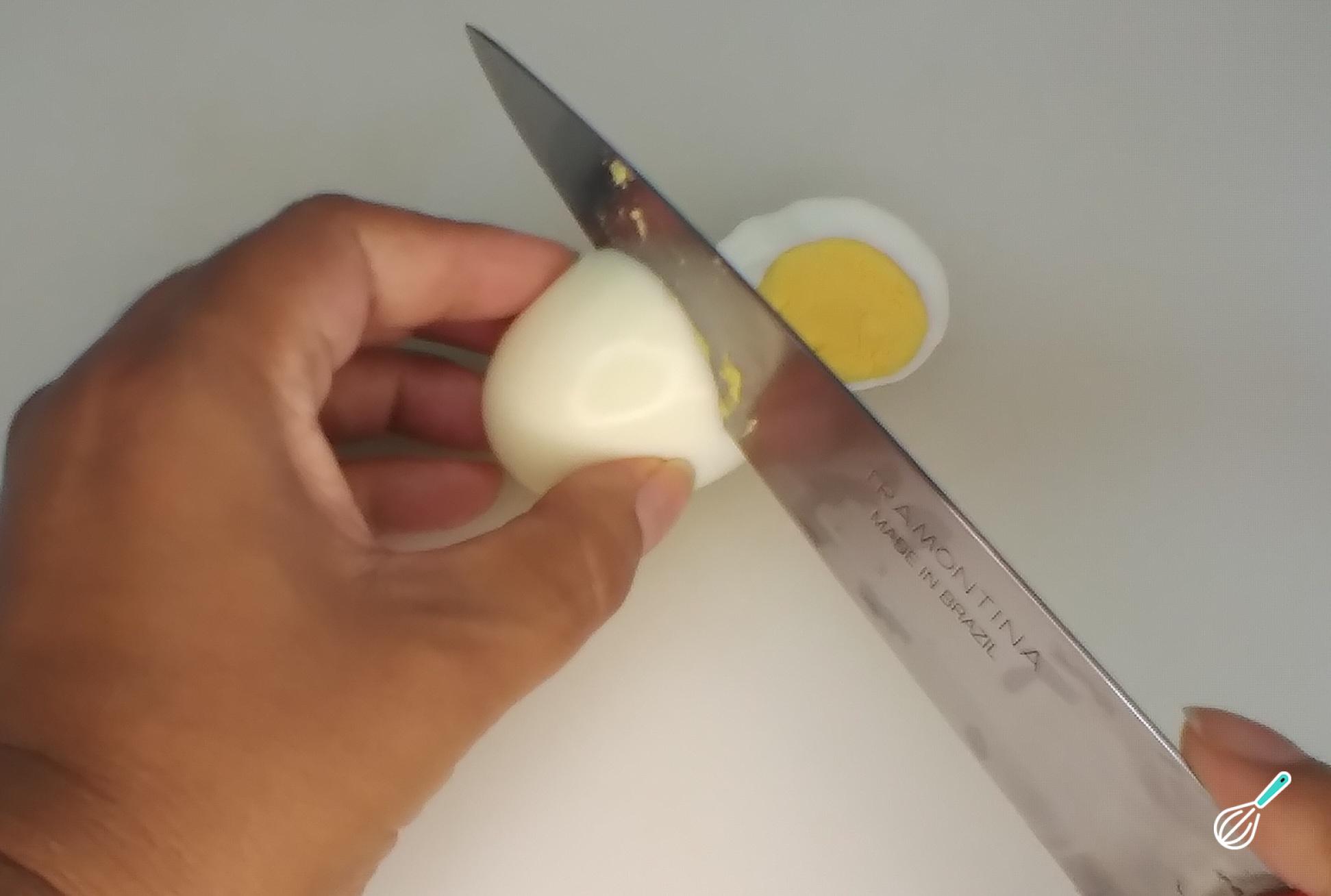 Depois de retirar os ovos da água e retirar a casca, corte em rodelas. Corte em rodelas médias. Não precisam ser fininhas. Reserve.