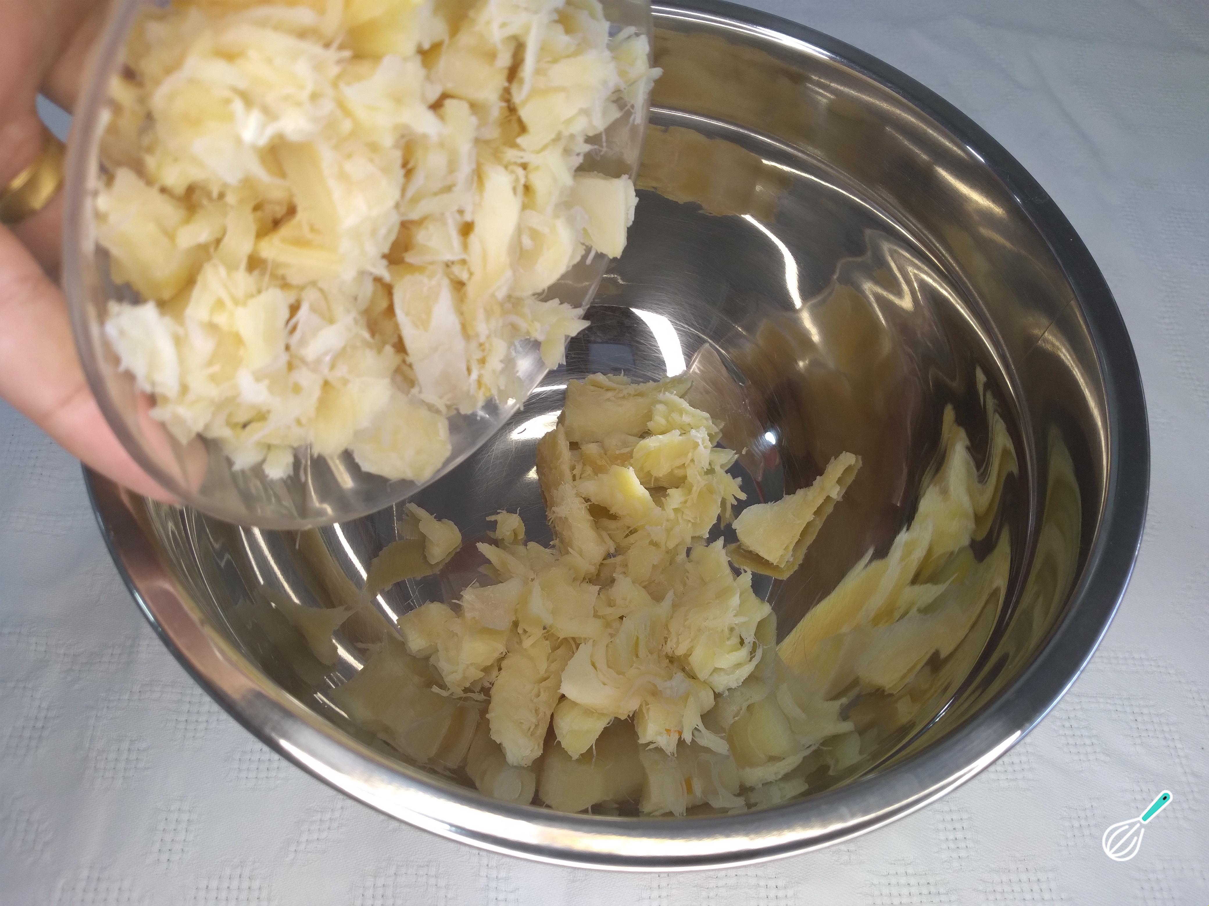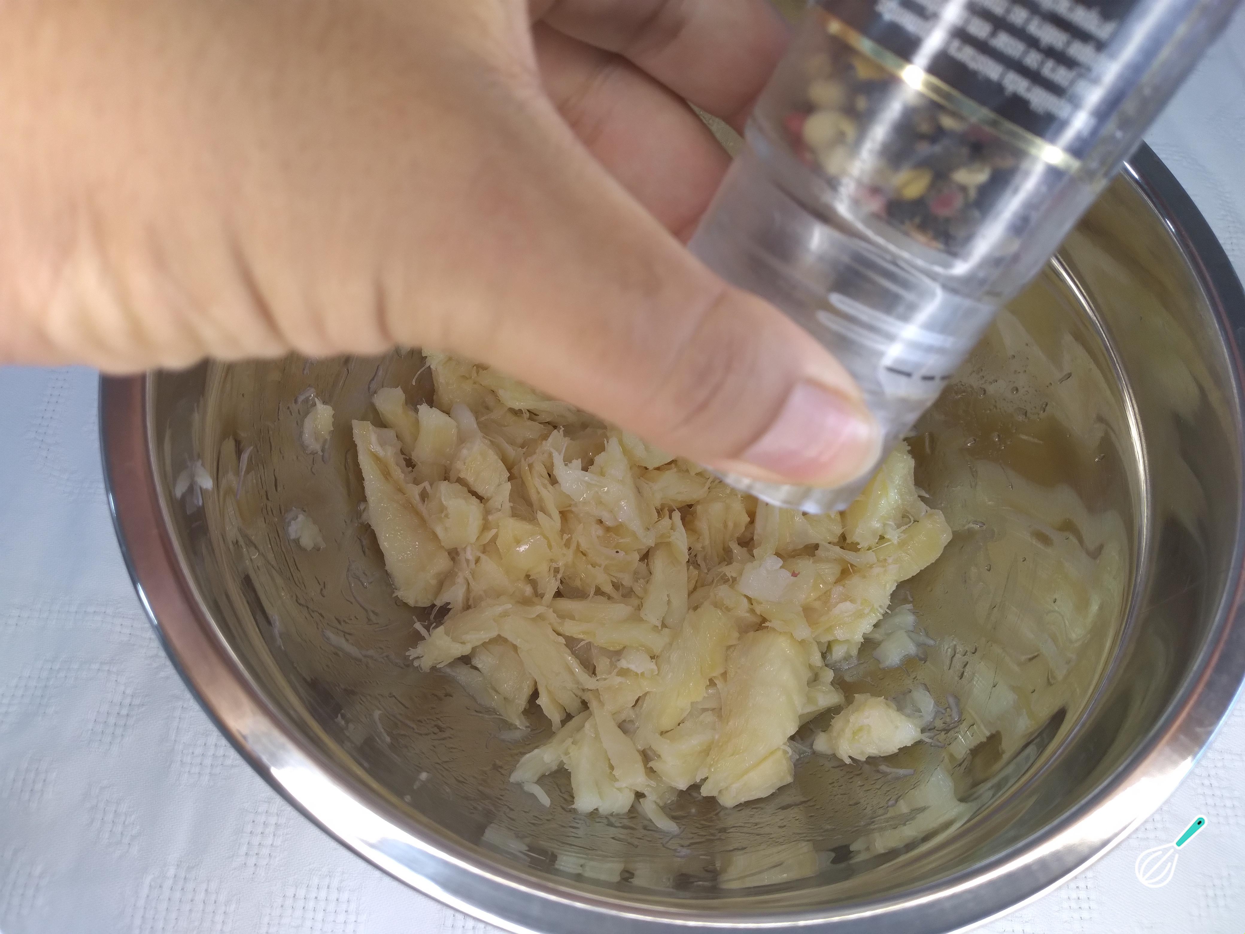 Em uma tigela, coloque o bacalhau desfiado, o azeite, esprema o limão e acrescente o suco e os temperos. Exceto a pimenta. Mexa bem para incorporar os sabores.