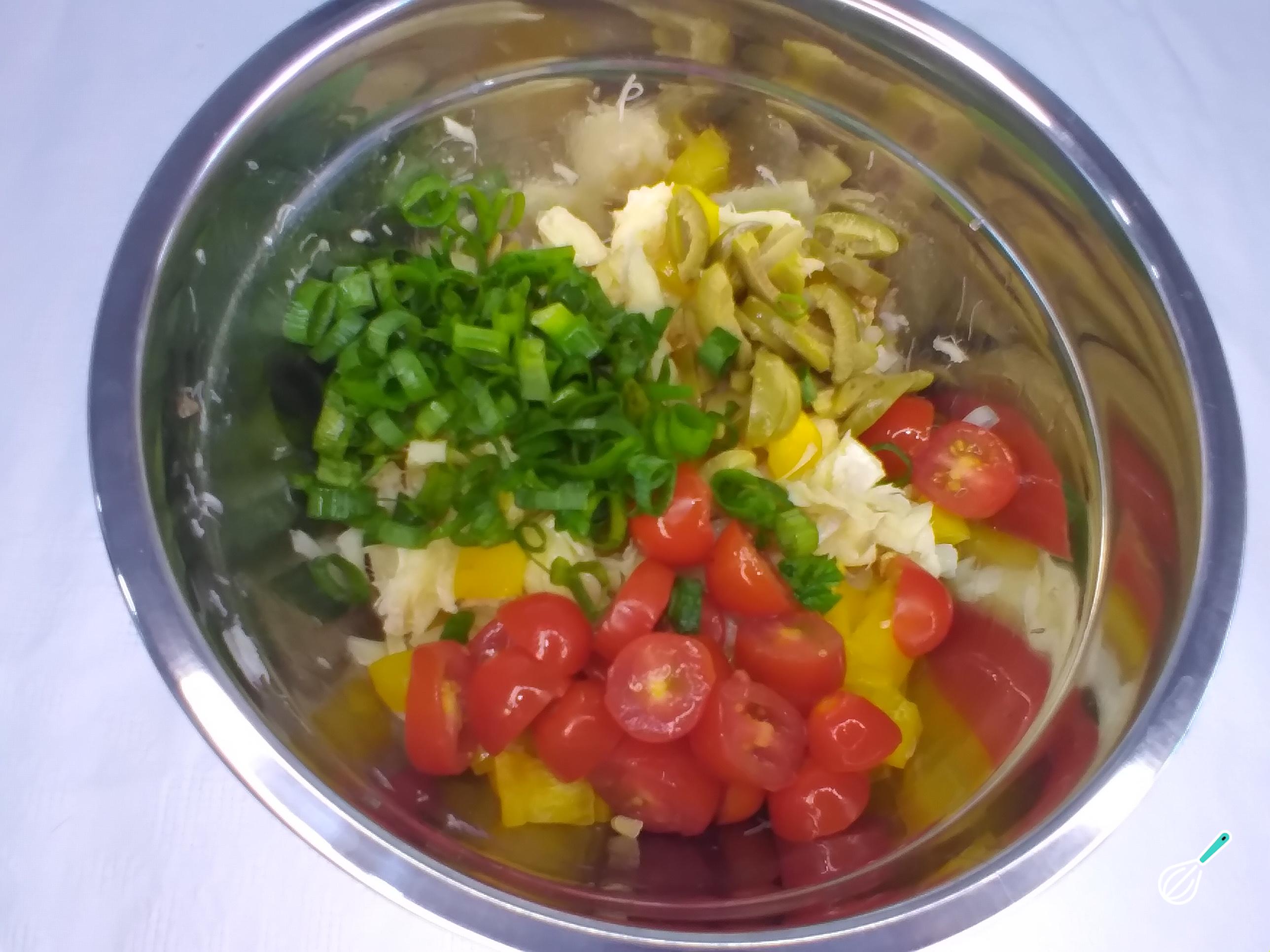 Acrescente o pimentão, a cebola branca e as azeitonas. Mexa bem e delicadamente para incorporar bem os sabores.